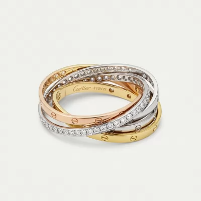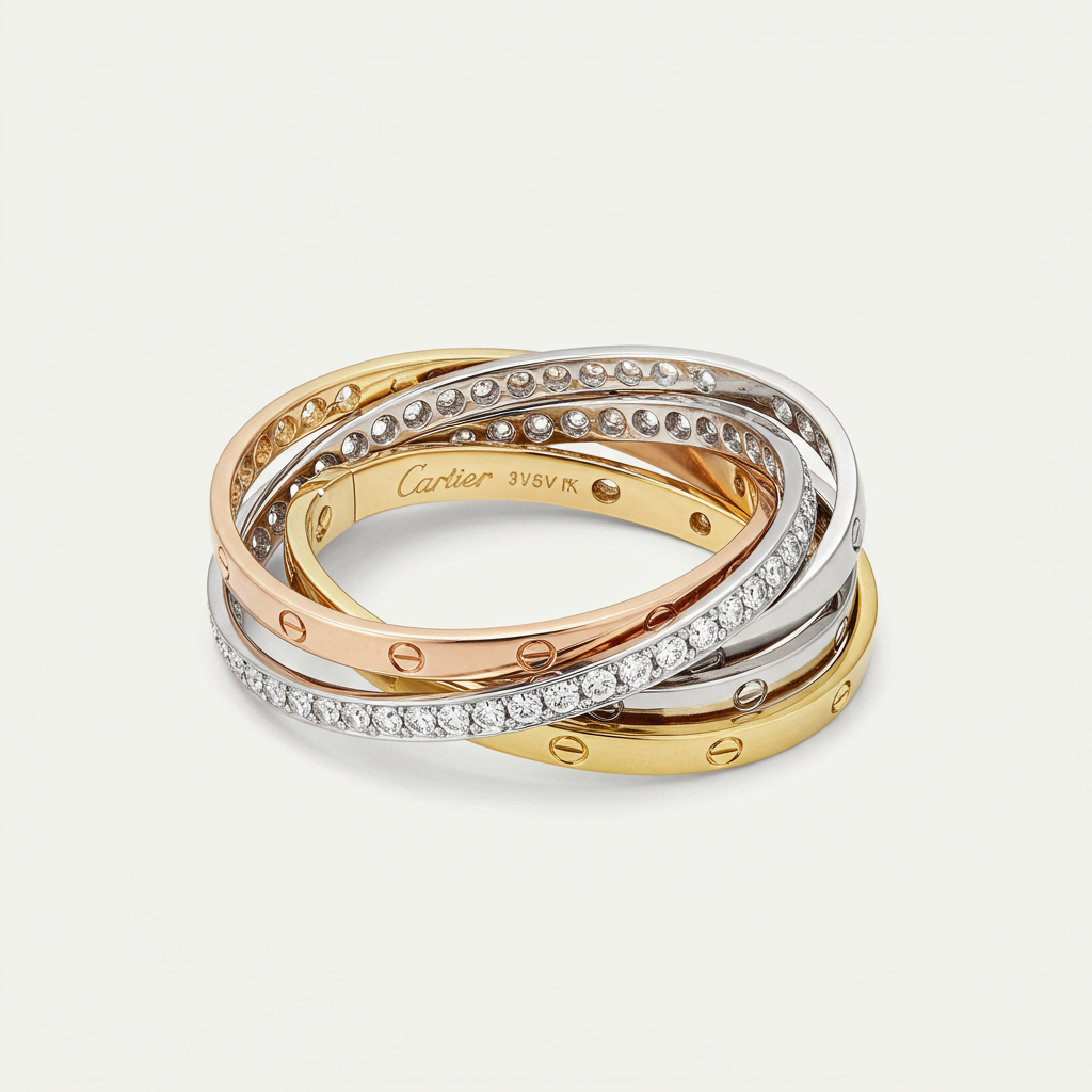 The Trinity Bracelet embodies timeless elegance, featuring three interwoven bands crafted from 18KT yellow, white, and rose gold. This iconic piece symbolizes fidelity, friendship, and love, seamlessly blending luxurious metals. One of the signature rings is meticulously pave-set with brilliant VVS diamonds, adding breathtaking sparkle and refinement. A true statement of sophisticated style, this bracelet is designed to be cherished for generations.