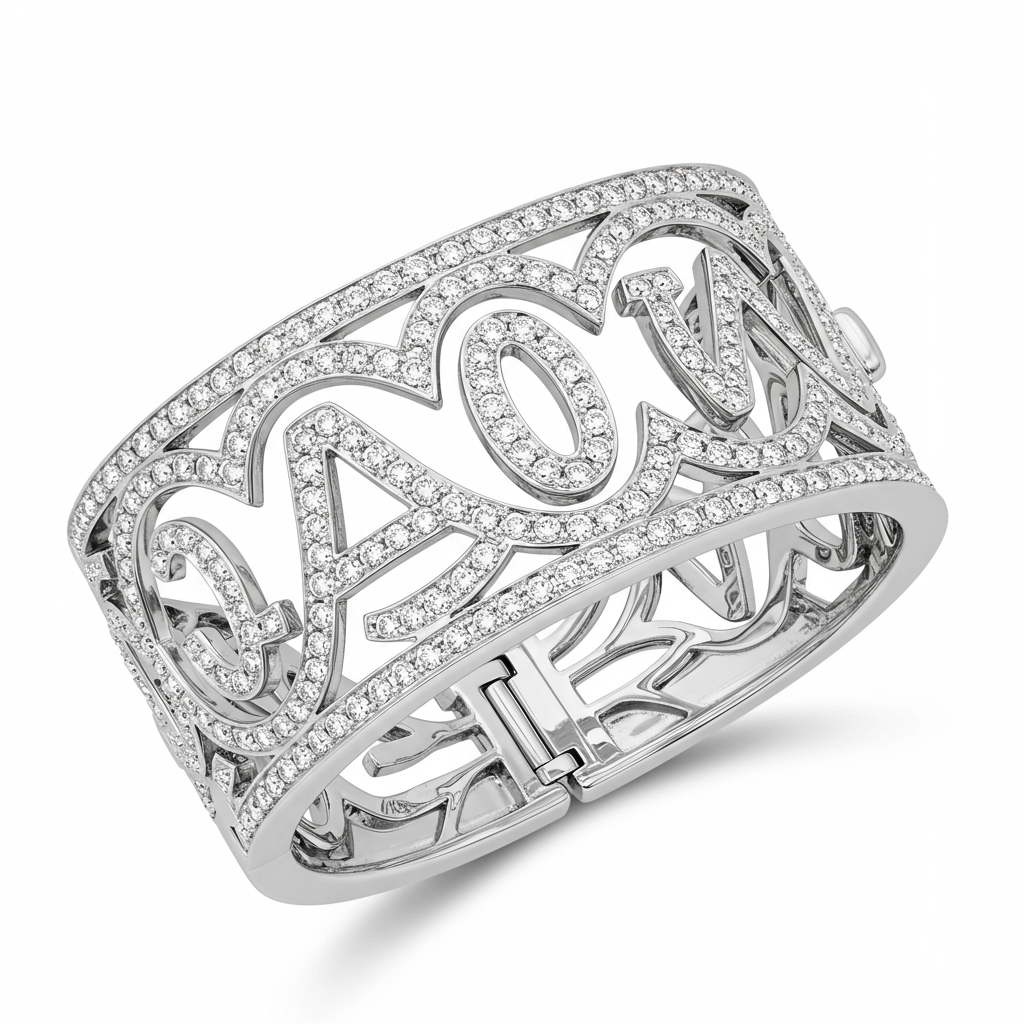This exquisite Christian Dior inspired cuff bracelet embodies timeless elegance and modern sophistication. Crafted in lustrous 18KT white gold, the fluid silhouette wraps gracefully around the wrist. The central design element is lavishly set with micro-pave diamonds, capturing light from every angle. It serves as a true statement piece, symbolizing luxury heritage and impeccable craftsmanship, perfect for the discerning collector.