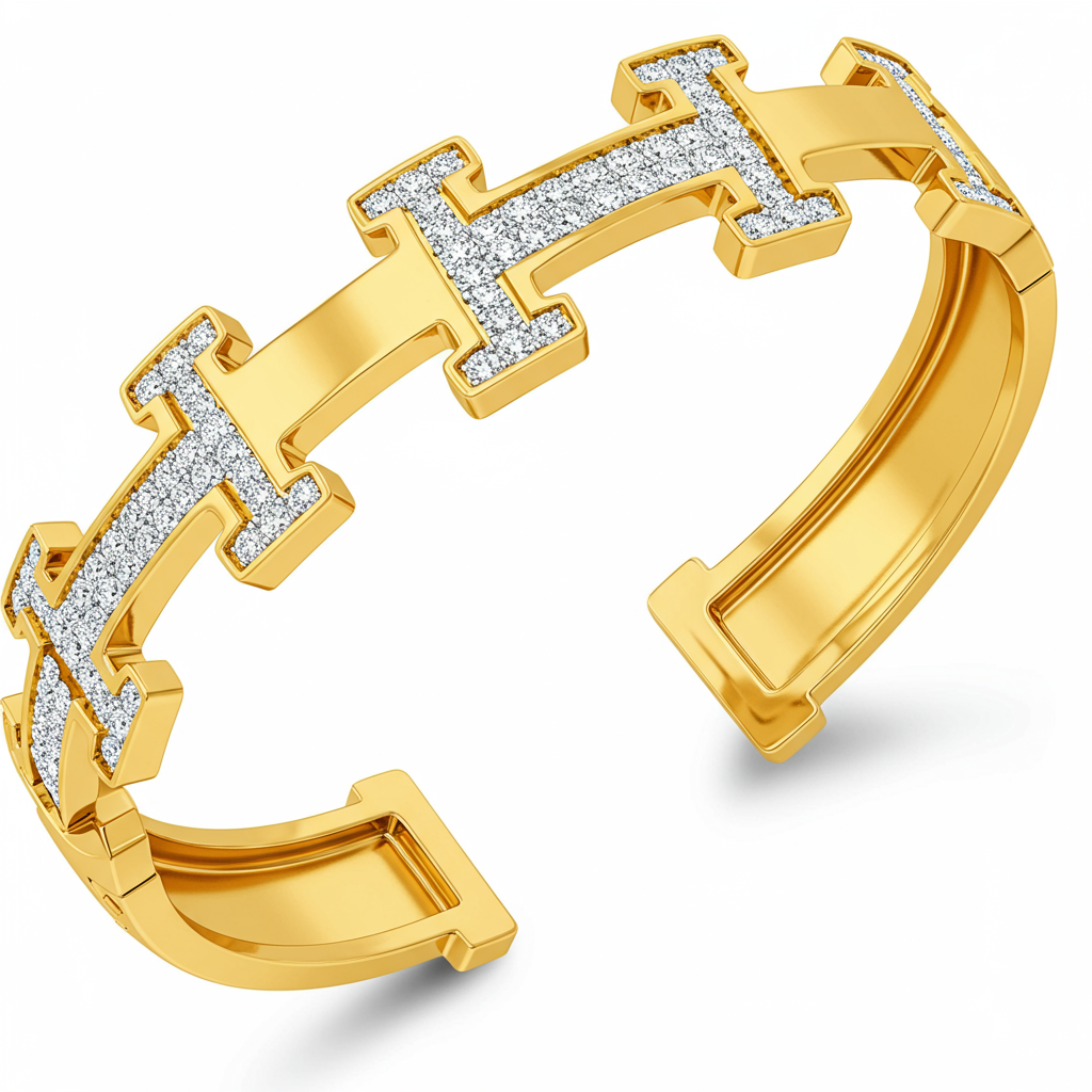 This Hermes-inspired cuff bracelet embodies timeless sophistication and modern luxury. Crafted in radiant 18KT yellow gold, its iconic H-motif structure is instantly recognizable and elegantly refined. The surface features meticulously set pave diamonds, emphasizing the sculptural lines of the piece. This bracelet is designed to be a statement accessory, perfect for adding a touch of prestige and brilliance to any ensemble.