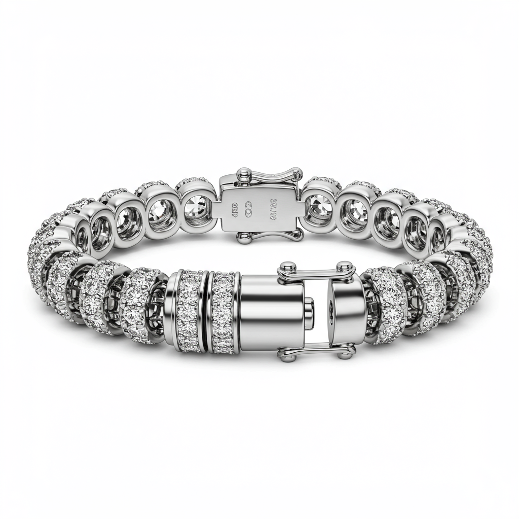 The Pandora Men's Bracelet redefines rugged elegance with a sophisticated bead-and-charm design, crafted entirely in rich 18KT white gold. This robust piece features intricate texture detailing on the primary bead components, subtly accented with pave-set VVS diamonds. It provides a contemporary, masculine accessory perfect for both daily wear and formal occasions. The secure, high-polish clasp ensures durability and comfort, making it a timeless addition to any distinguished collection.
