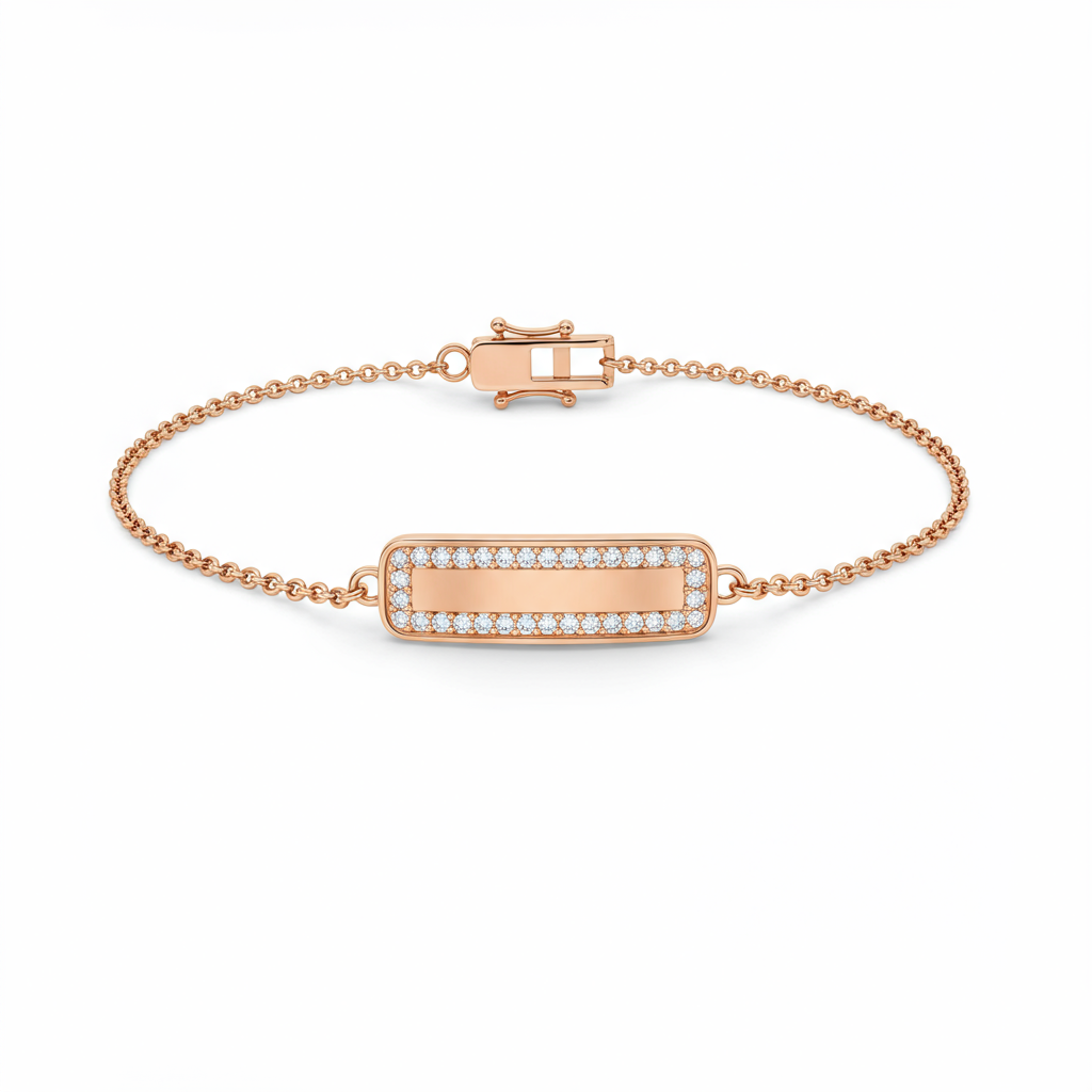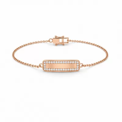 The Personalized Nameplate Bracelet is a testament to timeless elegance and sentimental value. Crafted in luminous 18KT rose gold, this delicate chain features a polished, rectangular plate perfect for custom engraving. Subtle VVS diamond accents frame the centerpiece, adding a touch of sophisticated sparkle. This heirloom-quality piece serves as an intimate signature worn gracefully on the wrist, making it the perfect gift for a loved one.