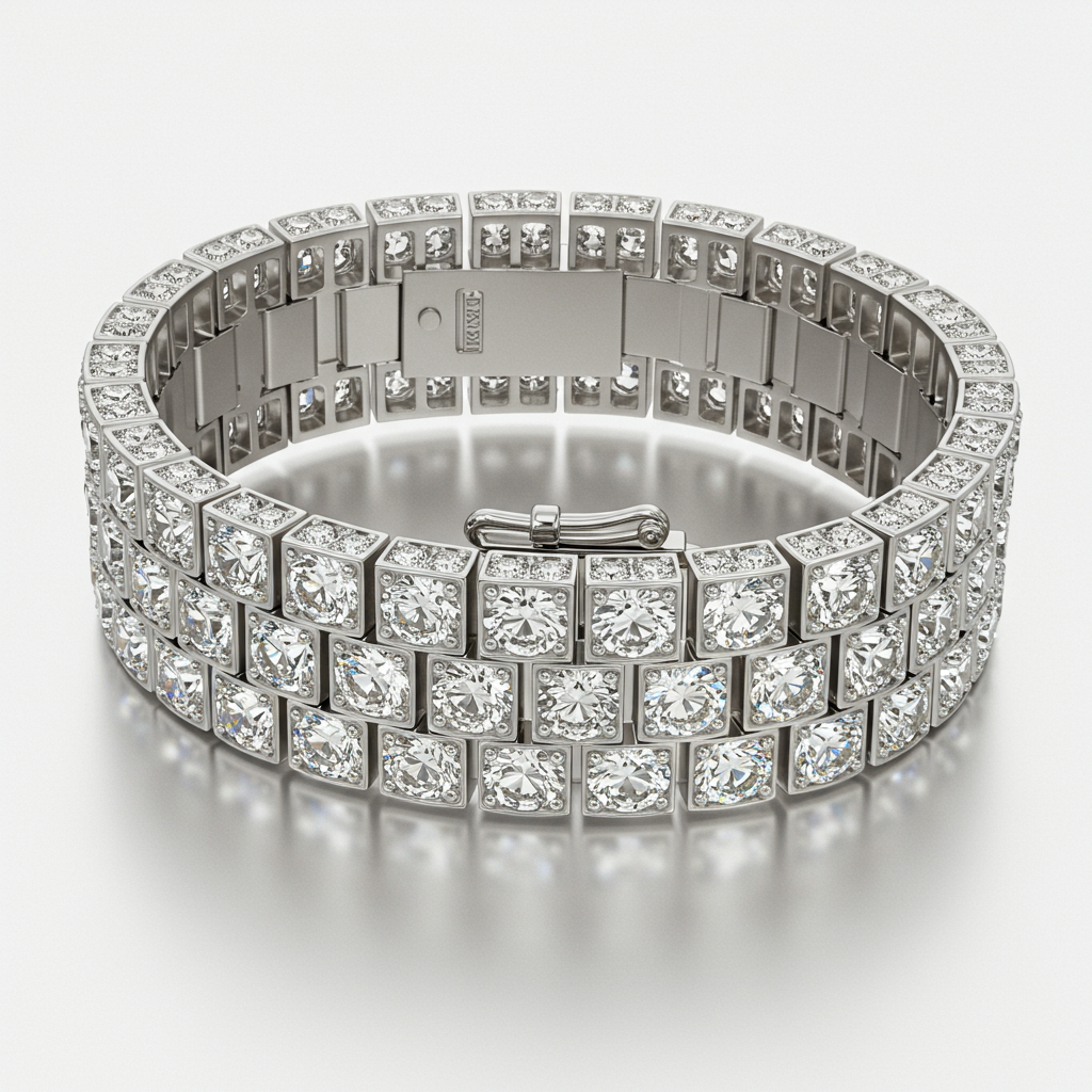 The Rolex-inspired Diamond Link Bracelet is an icon of timeless elegance and masterful craftsmanship. Crafted in polished 18KT white gold, this piece features perfectly integrated links that provide exceptional comfort and fluidity. Each link is meticulously pavé-set with brilliant round VVS diamonds, achieving an unparalleled sparkle that catches the light from every angle. This substantial bracelet is designed to be a definitive statement piece, ideal for high-luxury events or daily wear.