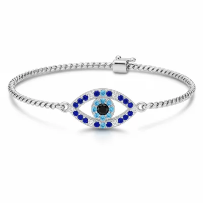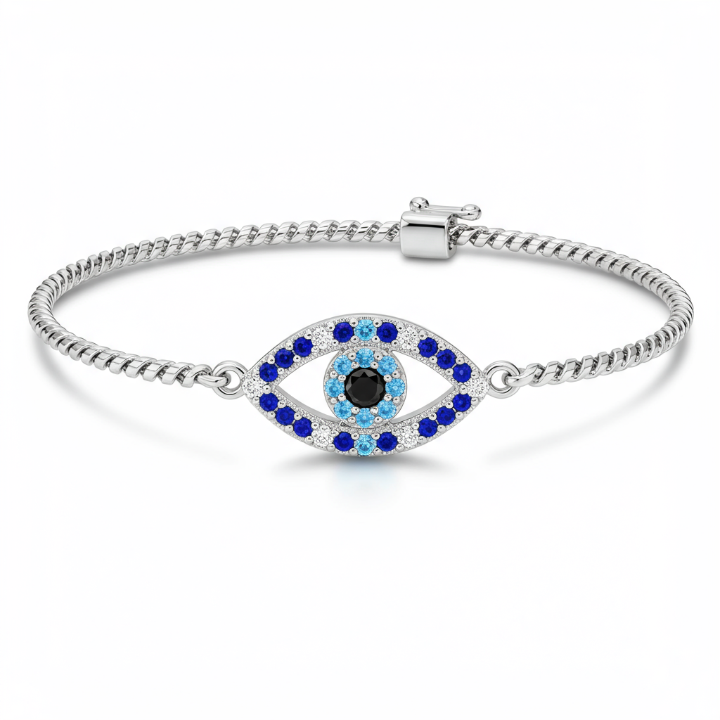 This mesmerizing Evil Eye Bracelet is a symbol of protection and style, masterfully crafted in gleaming 18KT white gold. The central charm features a delicate, vibrant blue sapphire surrounded by a halo of micro-pave diamonds, forming the iconic protective gaze. Suspended on a fine adjustable chain, this piece offers both elegance and meaningful symbolism. It is the perfect daily accessory, combining ancient tradition with modern luxury wearability.