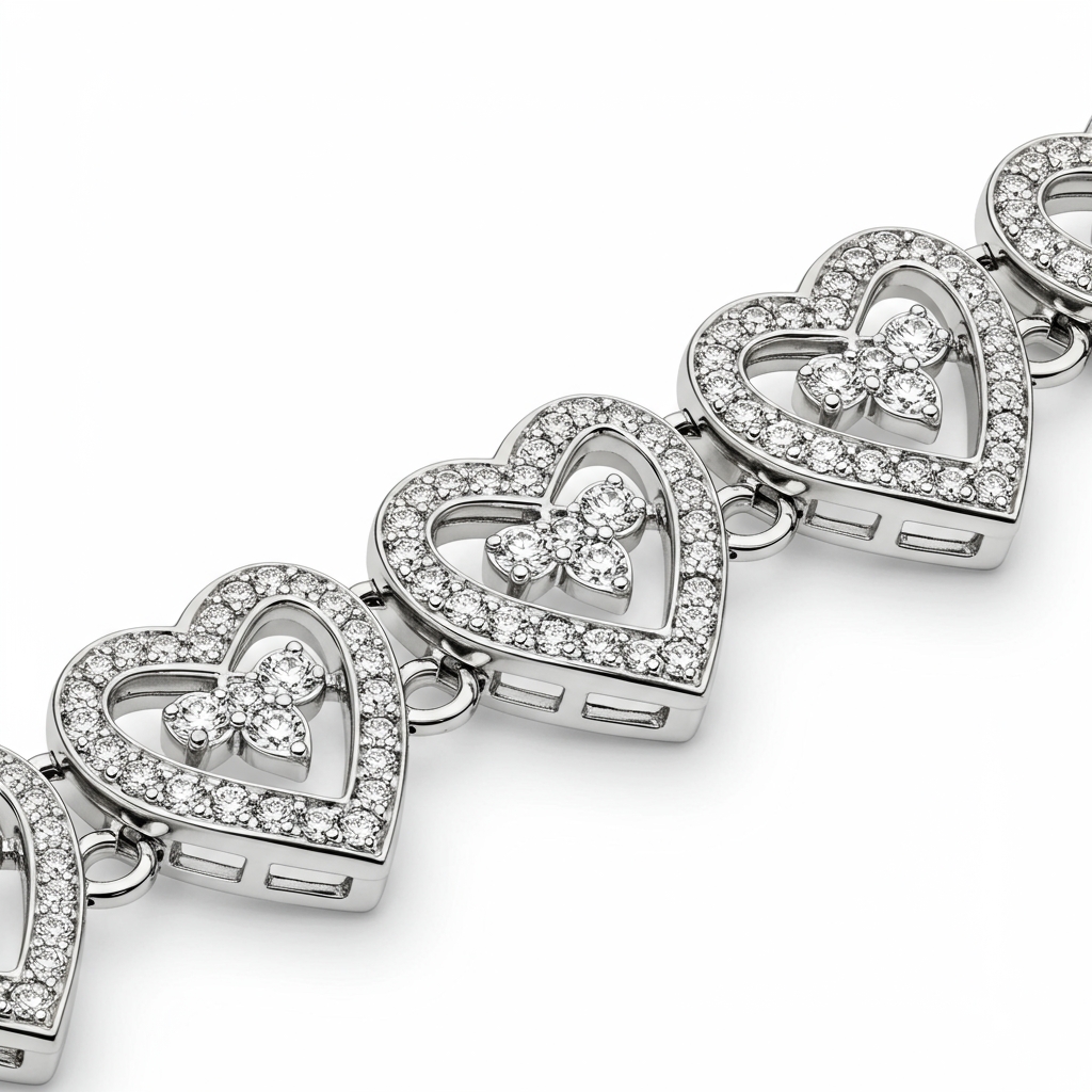 The Pandora Heart Bracelet is an exquisite expression of enduring love, meticulously crafted in radiant 18KT white gold. This delicate link design features a series of high-polish articulated heart motifs, symbolizing affection and connection. Adorned with micro-pave VVS diamonds totaling a substantial carat weight, the bracelet captures and reflects light brilliantly with every movement. A robust, secure clasp ensures comfortable daily wear, making this piece a cherished heirloom ready to celebrate life’s milestones.