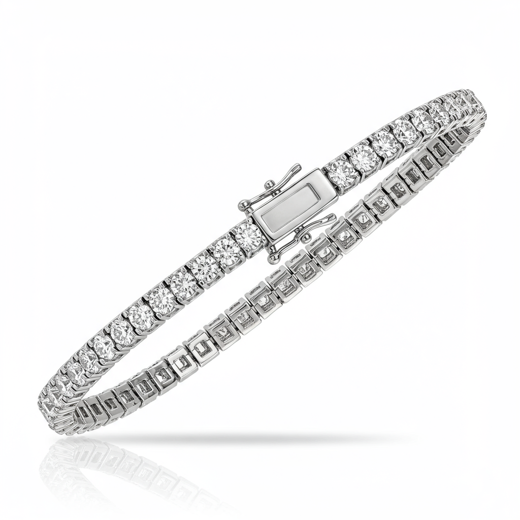 This exquisite Swarovski style Tennis Bracelet captures timeless elegance and brilliant sparkle. It features a continuous line of meticulously matched round diamonds, individually secured in robust 18KT white gold prongs. The flexible design drapes gracefully around the wrist, secured by a sleek box clasp with dual safety catches. Perfect for grand occasions or as a signature piece, this bracelet symbolizes enduring luxury and sophisticated taste.