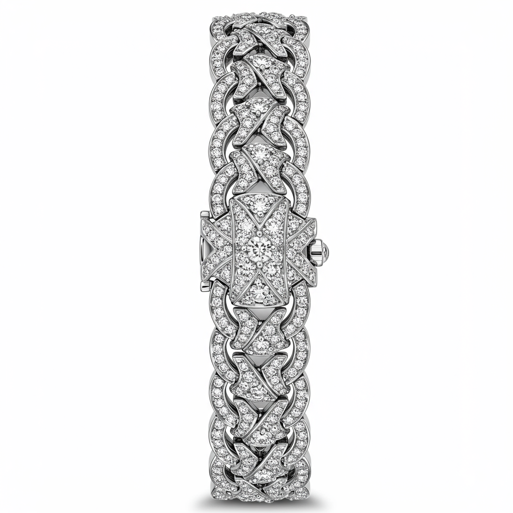 This extraordinary watch bracelet epitomizes precision engineering and opulent design, featuring perfectly articulated links that drape elegantly around the wrist. Crafted in luxurious 18KT white gold, the surface is entirely paved with exceptionally brilliant VVS round diamonds, creating an uninterrupted flow of sparkle. Its robust yet flexible construction ensures supreme comfort and durability, positioning it as a heritage-quality timepiece accessory. This piece offers a dazzling foundation for any high-end watch head, transforming the wearer's ensemble into a display of pure sophistication.