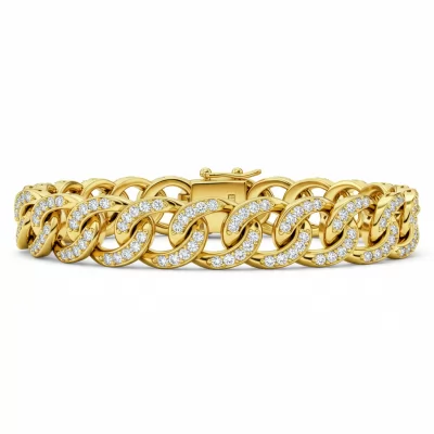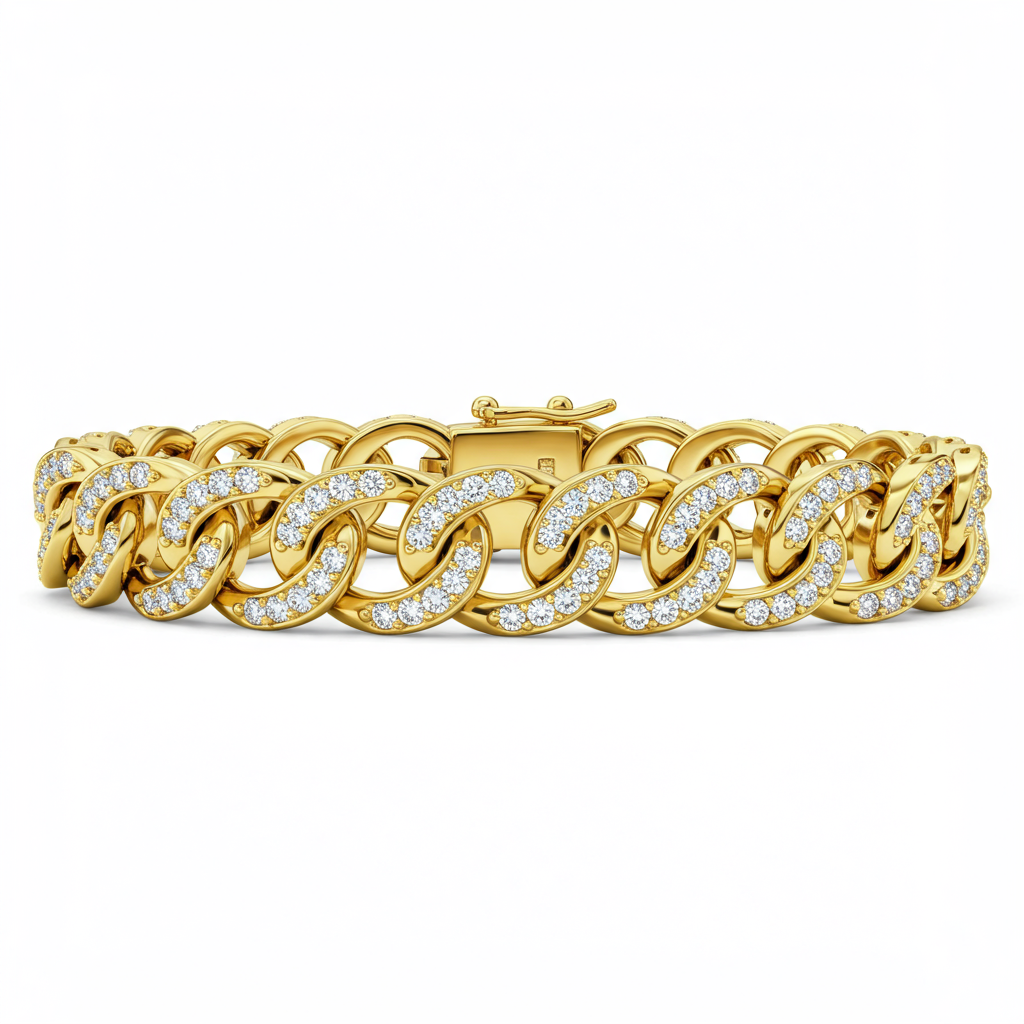 This exquisite 14k Yellow Gold bracelet features a stunning sequence of interlocking links, meticulously crafted to catch the light. Each segment is subtly adorned with brilliant round diamonds set in a secure micropave setting, enhancing its luxurious appeal. The bracelet provides an elegant drape around the wrist, suitable for both daily wear and sophisticated evening events. It is secured by a robust clasp mechanism, ensuring both comfort and lasting durability.