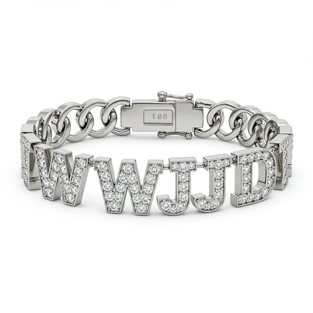 The WWJD Diamond Bracelet is a profound expression of faith translated into luxurious jewelry design. Crafted meticulously in 18KT white gold, this piece features articulate links pavé-set with brilliant VVS round diamonds. It serves as a continuous reminder of personal intention, combining deep spiritual meaning with effortless elegance. The secure box clasp ensures comfortable, daily wear while maintaining maximum brilliance and security.