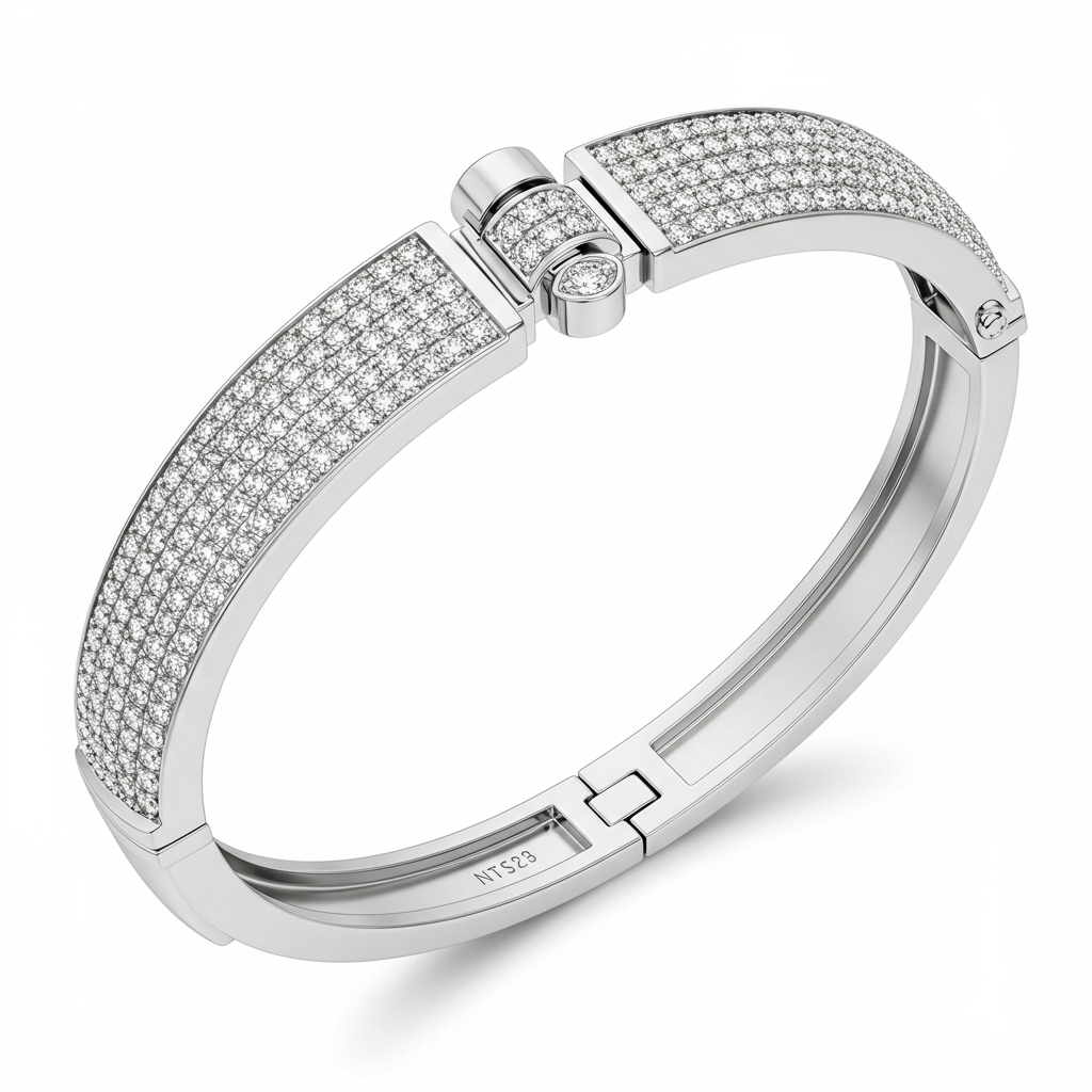 A revolutionary blend of high fashion and functional design, the Mosquito Repellent Bracelet redefines luxury utility wear. Crafted in polished 18KT white gold, this bangle features a sleek, hidden compartment designed to hold an essential oil repellent pad. The surface is meticulously adorned with micro-pave set VVS diamonds, creating a continuous band of scintillating light. This piece ensures effortless elegance and practical comfort, making it the ultimate accessory for sophisticated global travel.