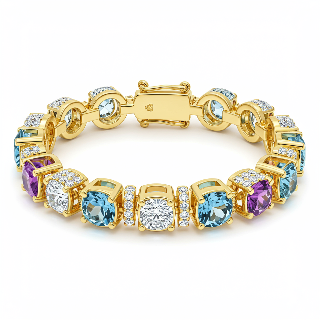 A sophisticated interpretation of the classic friendship bracelet, this 18KT yellow gold link bracelet captures the spirit of camaraderie with timeless elegance. The robust gold chain is interspersed with carefully selected, vibrant gemstone cubes, reminiscent of personalized letter beads. Each link is meticulously pavé-set with brilliant VVS G diamonds, ensuring maximum sparkle and luxury appeal. This statement piece transforms nostalgic sentiment into a heirloom-quality treasure, perfect for celebrating enduring bonds.
