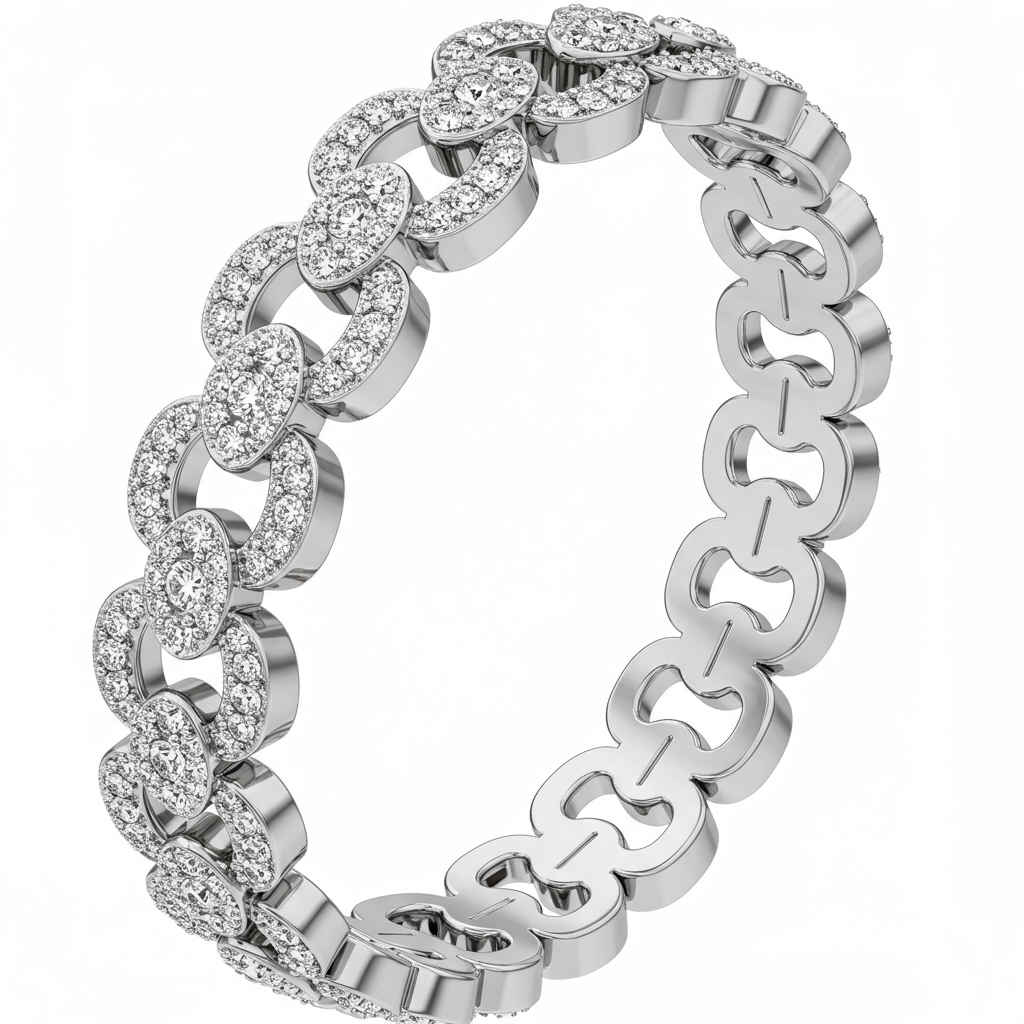 The Friendship Bracelet Pattern reinterprets a classic symbol of connection with opulent elegance. Crafted in highly polished 18KT white gold, this flexible link design features an intricate pattern fully set with scintillating VVS round brilliant diamonds. The fluid movement and impeccable craftsmanship ensure it drapes beautifully around the wrist, catching light from every angle. It serves as a sophisticated, enduring testament to cherished bonds, suitable for daily wear or grand occasions.