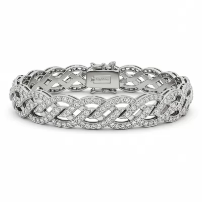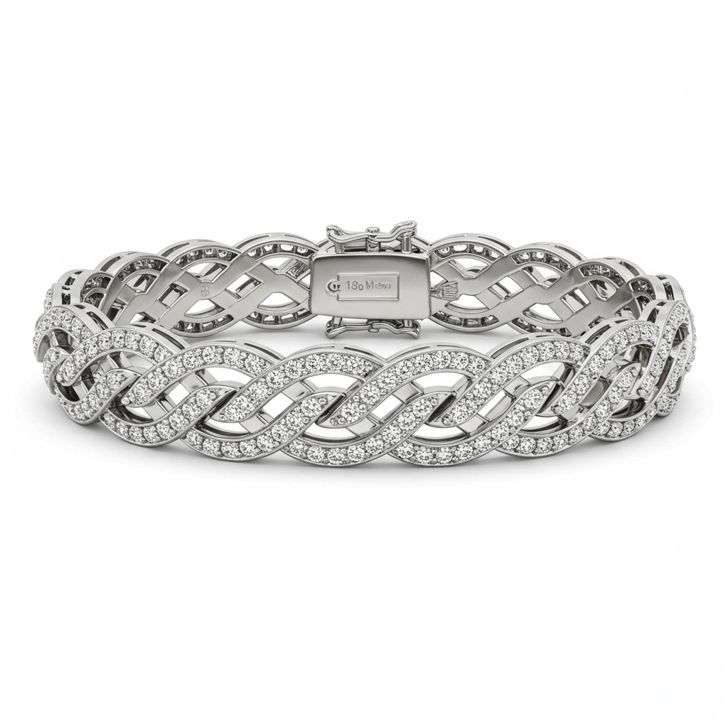 The 'friendship bracelets patterns' collection redefines sentimental jewelry through expert craftsmanship. This elegant bracelet features intricately woven 18KT white gold links, providing a rich, textured foundation. Brilliant VVS accent diamonds are strategically set across the pattern, catching the light with every movement. A symbol of enduring connection, this piece combines the nostalgic charm of a friendship bracelet with uncompromising luxury and quality. It is secured by a high-polish, safety-clasp closure for peace of mind.