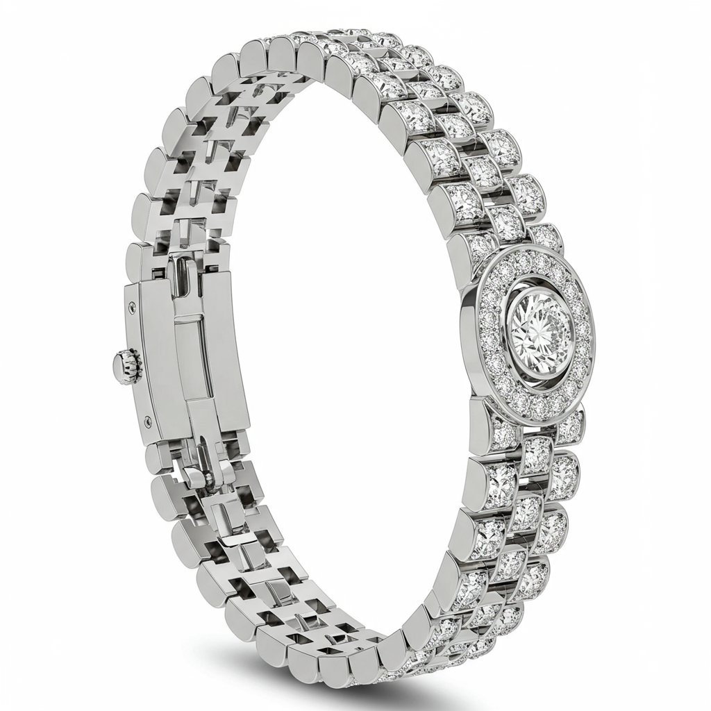 The Rolex Jubilee Bracelet is an iconic design, meticulously reinterpreted here in dazzling 18KT white gold. This masterpiece features the signature five-piece links, where the smaller center sections are meticulously set with VVS clarity diamonds. Engineered for comfort and enduring style, the flexible construction drapes flawlessly around the wrist, offering unparalleled luxury. It secures with a concealed deployment clasp, making it a powerful statement piece for the discerning collector. This luxurious bracelet elevates any ensemble and is a true testament to exceptional craftsmanship.