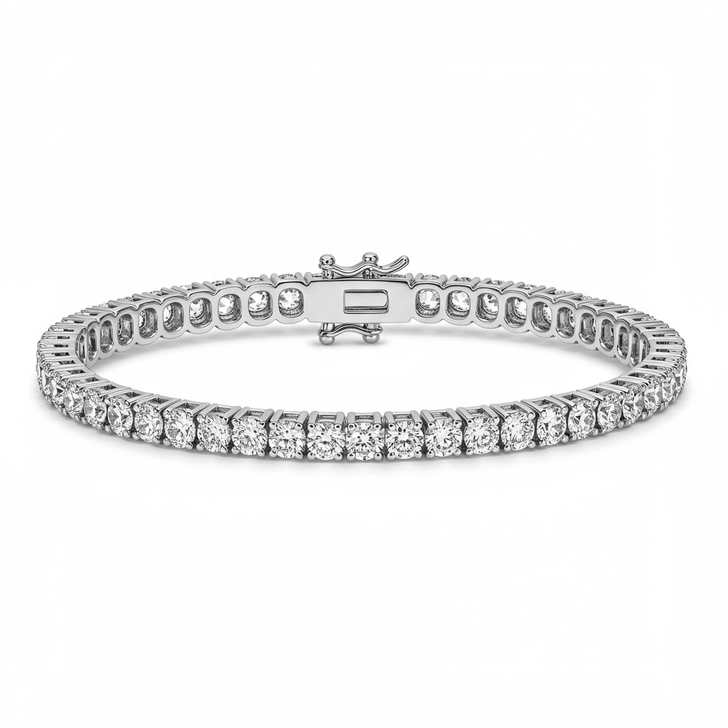 Experience timeless elegance with this exquisite 18KT white gold tennis bracelet, meticulously set with a continuous line of brilliant round diamonds. Each stone is carefully selected for its superior VVS clarity and stunning colorless sparkle, ensuring maximum fire and brilliance. The flexible articulation of the links allows the bracelet to drape beautifully around the wrist, offering supreme comfort and dazzling movement. This piece epitomizes luxury and is designed to be a cherished heirloom, perfect for formal events or elevating everyday wear.