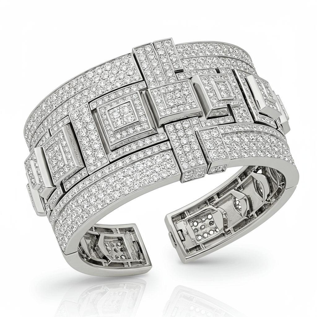 The Men's Van Cleef inspired bracelet is an embodiment of modern masculinity and unparalleled luxury. Crafted in robust 18KT white gold, this solid cuff features the iconic geometric motif design, expertly set with brilliant round VVS diamonds. Its substantial weight and refined finish ensure a comfortable fit and commanding presence on the wrist. This piece serves as the ultimate statement accessory for the discerning gentleman who values precision and timeless style.