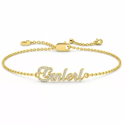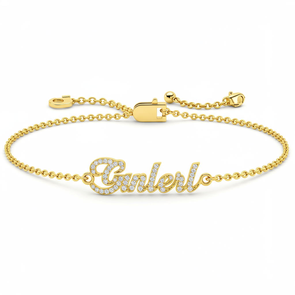 Celebrate individuality with this exquisite personalized name bracelet, meticulously crafted in radiant 18KT gold. Each letter is delicately outlined and paved with brilliant, hand-set VVS diamonds, ensuring maximum sparkle and luxury. The fine chain provides an elegant drape, making it perfect for everyday wear or a cherished gift. This bespoke piece serves as a timeless emblem of identity and sophisticated craftsmanship.