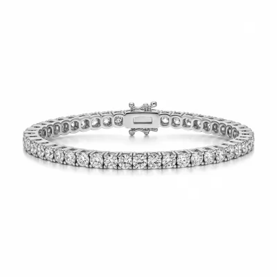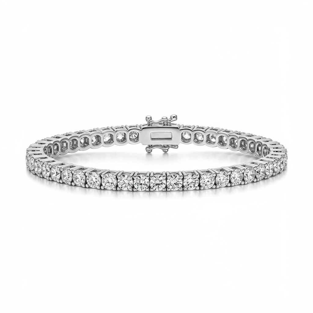 This exquisite tennis bracelet defines timeless elegance, meticulously set with a continuous row of brilliant round diamonds. Crafted in luxurious 18KT white gold, each VVS clarity diamond catches the light with unparalleled fire and brilliance. The flexible design ensures comfort and security, fastening with a sophisticated box clasp and dual safety catches. This iconic piece is the perfect addition to any fine jewelry collection, designed to be cherished for generations.