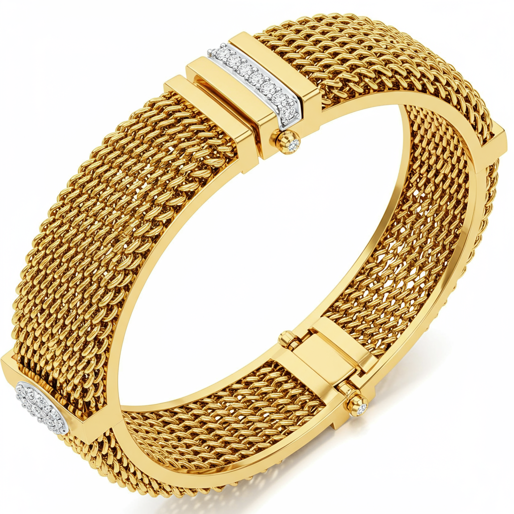The Italian Bracelet is a masterwork of flexible 18KT yellow gold craftsmanship, featuring an intricate mesh link design. This piece embodies timeless European luxury and sophisticated elegance. Its fluid movement and highly polished finish catch the light beautifully, ensuring it remains an eye-catching statement accessory. Secured by a discreet, diamond-accented clasp, the bracelet offers both security and seamless design integration. It is a defining piece for any fine jewelry collection, perfect for day or evening wear.