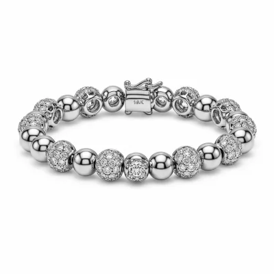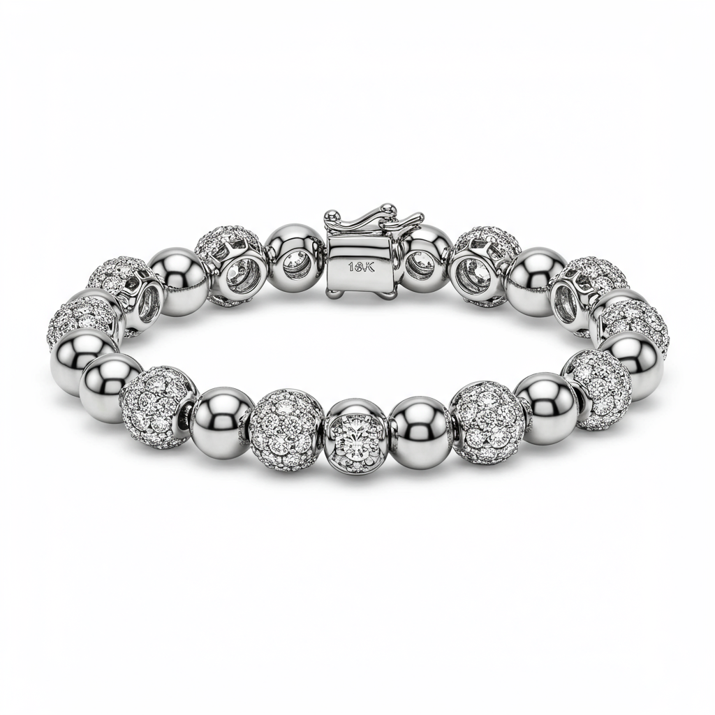 This exquisite 'bracelet from beads' features a fluid, flexible design crafted from lustrous 18KT white gold. Each segment alternates between polished metal orbs and meticulously set micro-pave diamond beads, creating dazzling sparkle along the wrist. This piece offers sophisticated texture and movement, making it a perfect statement accessory for both daily wear and elegant evening events. Its contemporary yet timeless structure ensures enduring appeal and luxurious comfort.