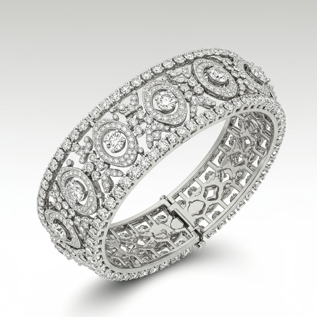 This exquisite 'bracelet patterns' design showcases intricate geometric artistry, meticulously set with brilliant-cut diamonds. Crafted in luminous 18KT white gold, the piece offers unparalleled sparkle and structural elegance, making it a statement accessory for grand occasions. The delicate yet robust setting ensures maximum light entry, enhancing the VVS diamond brilliance. It is a timeless heirloom piece designed to wrap the wrist in sophisticated luxury.