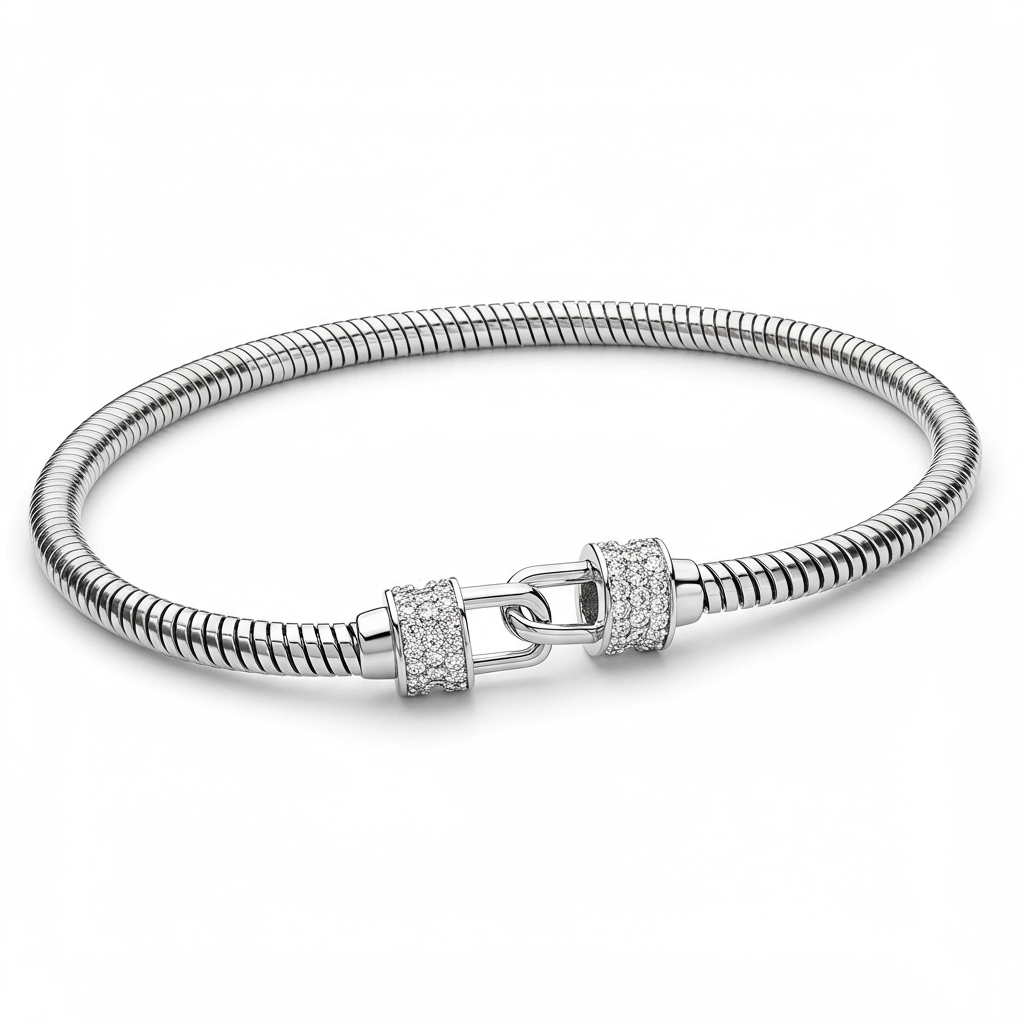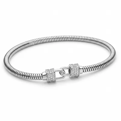 This iconic Pandora-style bracelet is meticulously crafted from high-polish sterling silver, designed to showcase an evolving collection of charms. The secure barrel clasp is subtly accented with a delicate pave of brilliant VVS diamonds, adding a touch of brilliance to the classic snake chain design. Its flexible construction ensures comfort while providing a durable foundation for treasured memories. This piece serves as the perfect canvas for personalization and timeless style.