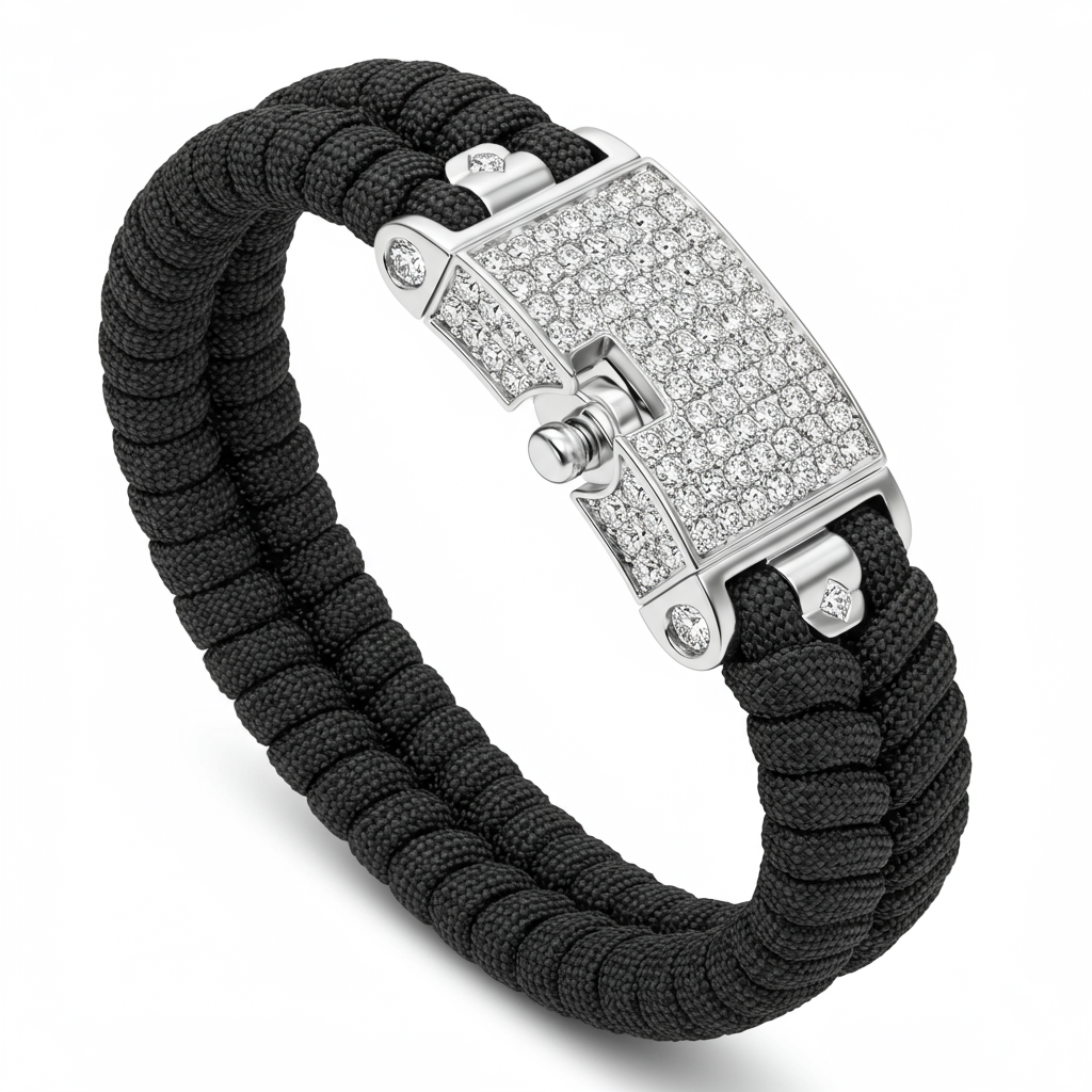 The Paracord Bracelet collection fuses utilitarian strength with luxurious precision. This piece features a meticulously crafted 18KT white gold clasp, detailed with micro-pave set VVS diamonds. The durable, high-density paracord offers a striking contrast to the brilliance of the fine metalwork. Designed for the modern adventurer, this bracelet is a testament to sophisticated, everyday luxury, ensuring reliability without compromising elegance.