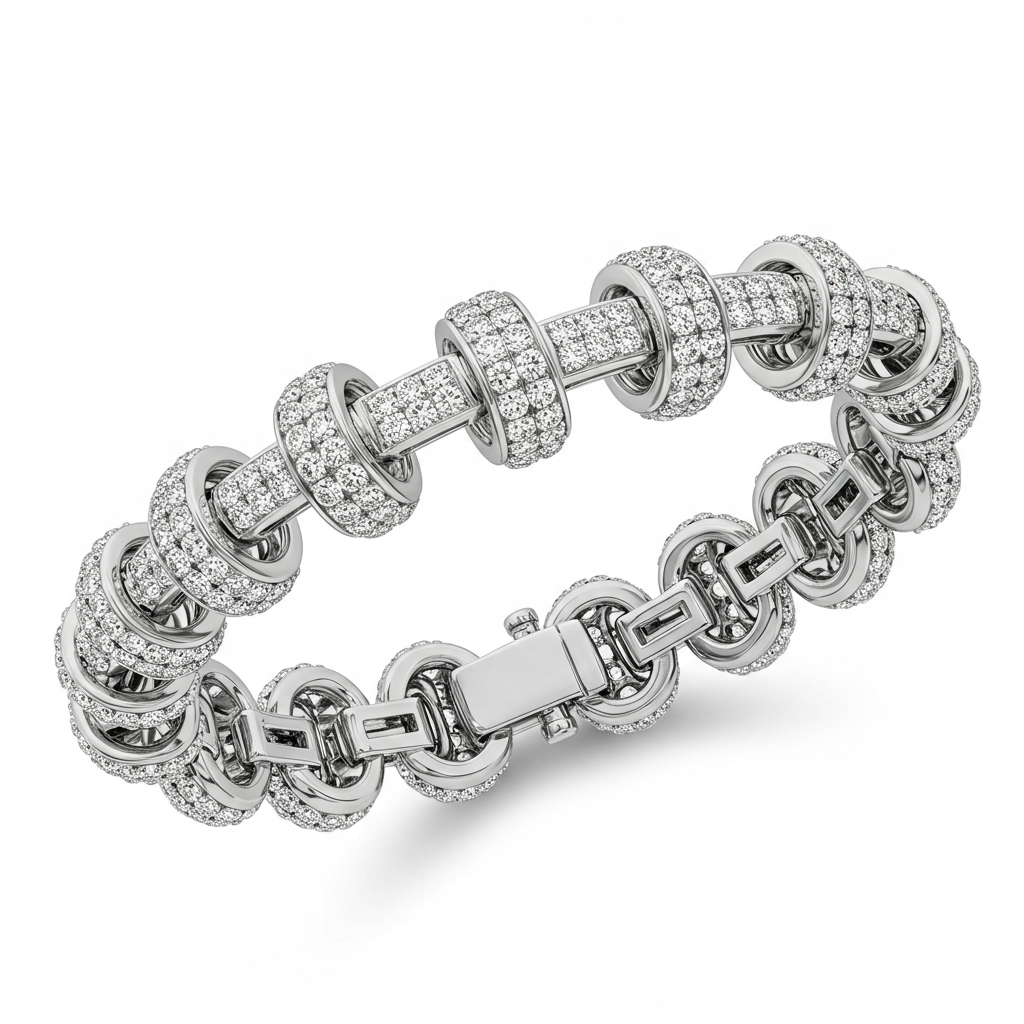 The Sticki Rolls Bracelet is a masterpiece of modern geometry and sparkling precision. Crafted in polished 18KT white gold, this design features interlocking cylindrical links meticulously set with brilliant micro-pave diamonds. The continuous flow and tactile texture give the piece a dynamic presence on the wrist, reflecting light from every angle. This bracelet serves as a sophisticated statement accessory, perfect for both day wear and grand evening events, representing ultimate luxury and contemporary craftsmanship.
