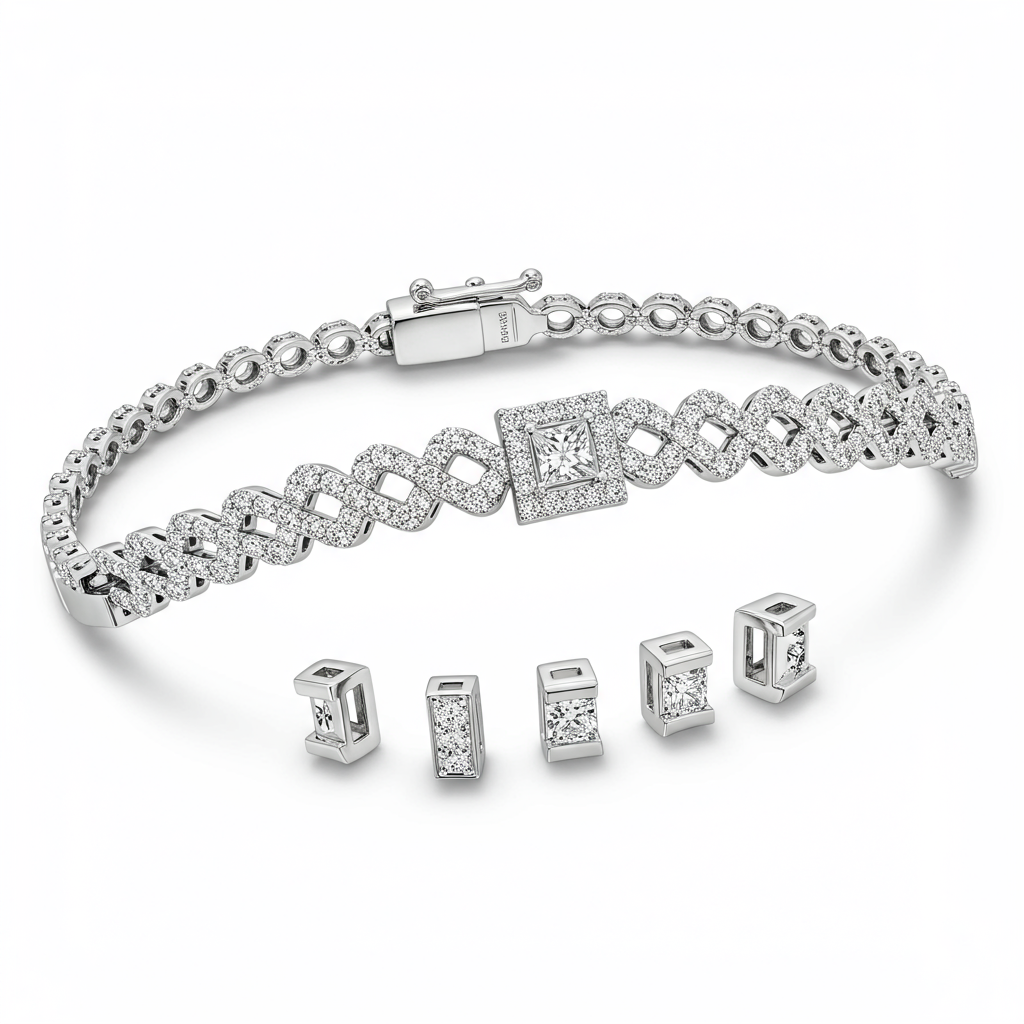 The ultimate luxury modular friendship bracelet kit offers bespoke customization and high-end craftsmanship. This 18KT white gold design features shimmering pavé diamonds across its main links, providing exceptional brilliance and sparkle. The kit includes interchangeable elements, allowing for personalized styling and expression of unique bonds. It represents a timeless symbol of connection, elevated by VVS clarity diamonds and superior finishing.