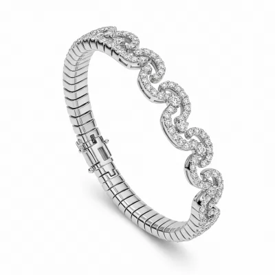 The Diamond Leg Bracelet redefines ankle adornment with its fluid movement and exceptional sparkle. Crafted in sleek 18KT white gold, this piece features a flexible chain meticulously set with brilliant-cut diamonds. Its secure, adjustable clasp ensures comfortable wear while gracefully highlighting the natural contours of the leg. This luxurious accessory provides an exquisite statement, perfect for upscale events or sophisticated daily wear, promising unmatched attention to detail and brilliance.