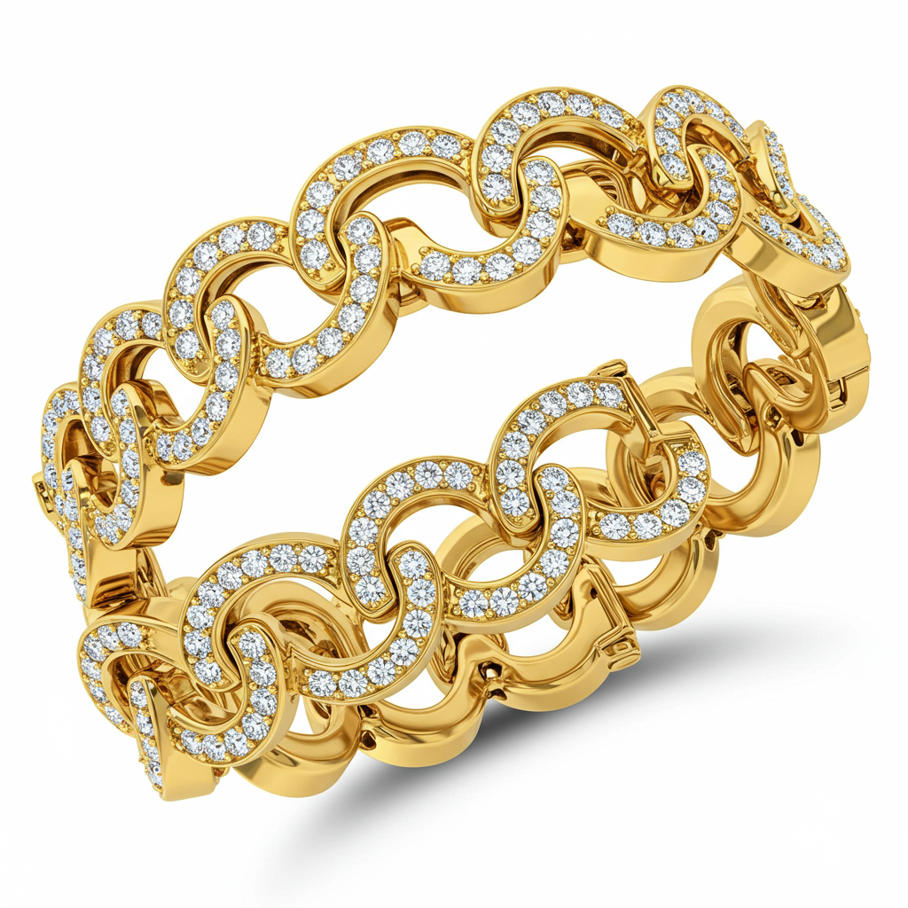 The 'van cleef bracelet price' inspired Motif Link Bracelet is the epitome of timeless luxury, meticulously crafted in radiant 18KT yellow gold. This exceptional piece features intricate clover motifs, fully paved with 5.50 carats of stunning VVS clarity round brilliant diamonds. Its delicate yet impactful design captures light from every angle, promising unparalleled brilliance and sophistication. Secured with a concealed clasp, this bracelet drapes elegantly around the wrist, offering a statement of enduring elegance and fine craftsmanship.