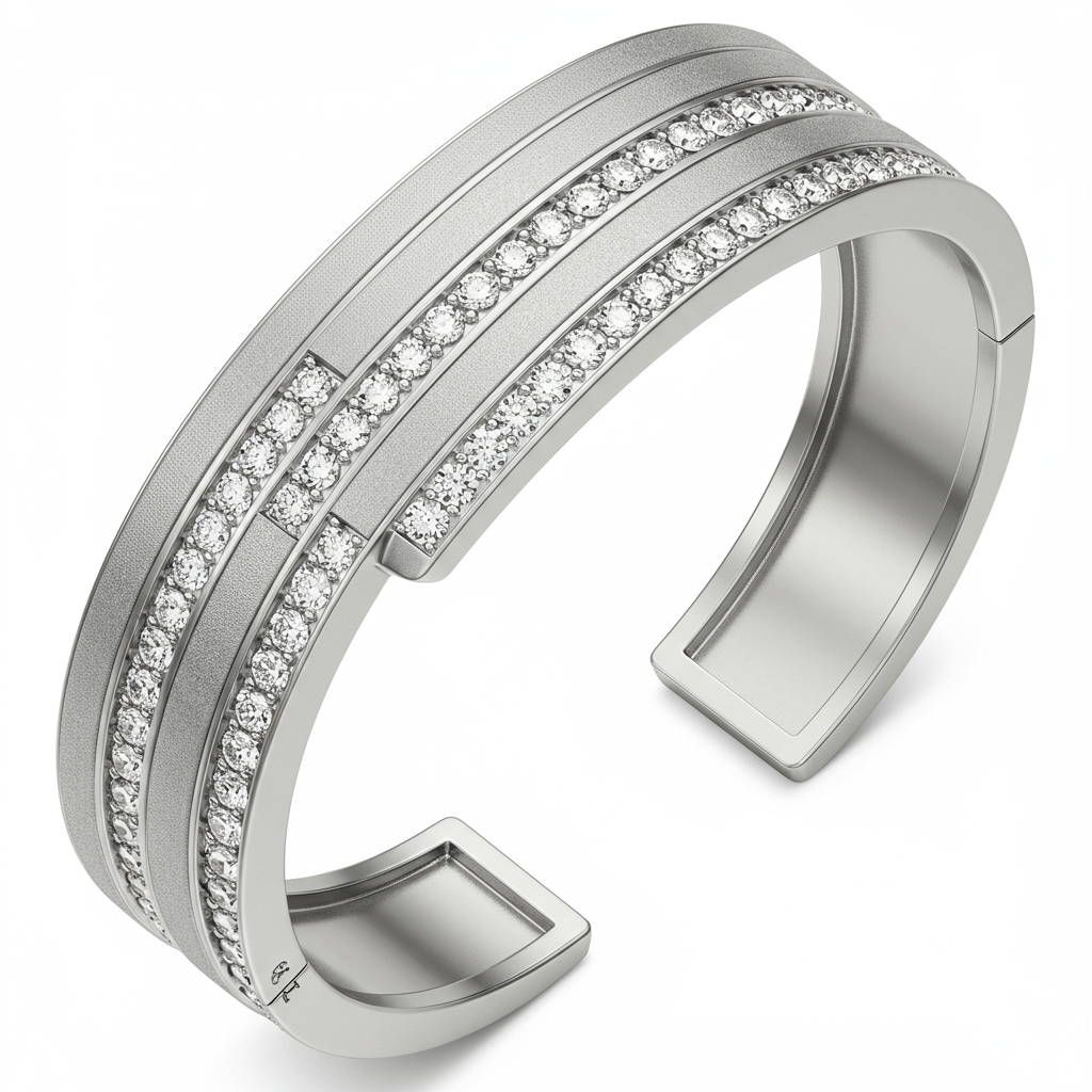 The Van Cleef Men's Bracelet redefines masculine luxury with its bold yet sophisticated design. Crafted in polished 18KT white gold, this cuff features clean lines punctuated by meticulously set VVS diamonds. It merges traditional craftsmanship with contemporary geometric aesthetics, making it a perfect statement piece for the modern gentleman. The secure hinge mechanism ensures comfortable daily wear without compromising on high style.