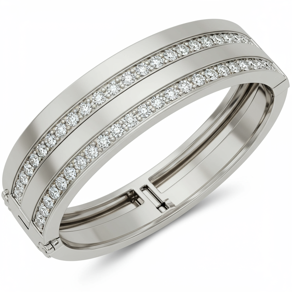 This iconic Van Cleef inspired men's bracelet embodies sophisticated strength and timeless elegance. Crafted meticulously in 18KT white gold, its robust structure is seamlessly combined with subtle luxury. The highly polished surface features hidden diamond accents, providing a distinguished sparkle suitable for the modern gentleman. This hinged bangle is designed for supreme comfort and secure wear, making it an essential addition to any high-caliber jewelry collection.
