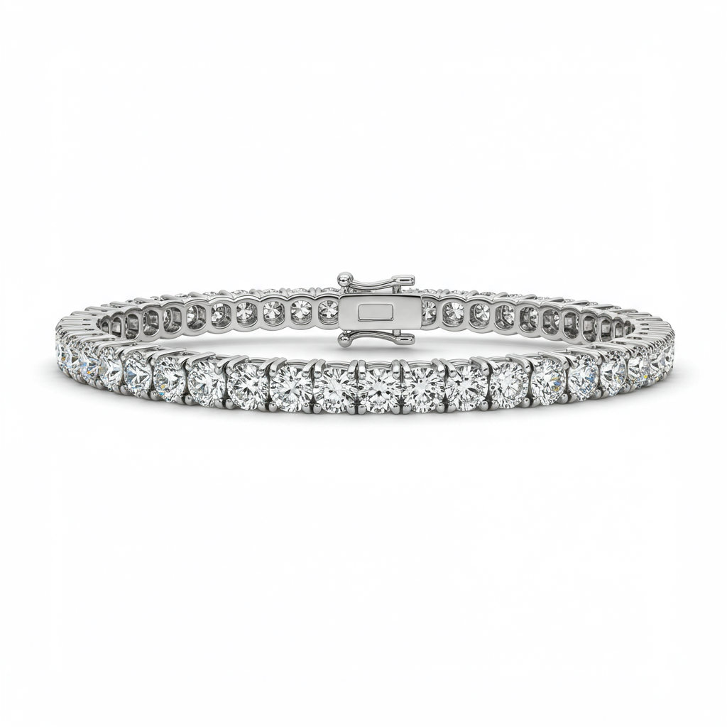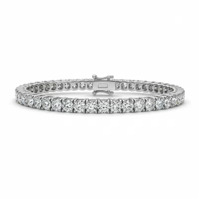 The women's tennis bracelet epitomizes timeless elegance and exceptional craftsmanship, featuring a continuous line of perfectly matched, brilliant round diamonds. Set meticulously in lustrous 18KT white gold, this piece offers breathtaking scintillation with every movement. The secure box clasp mechanism ensures comfortable and safe wear, making it an ideal signature statement for grand occasions. This classic design is a luxurious investment crafted to be cherished for generations.