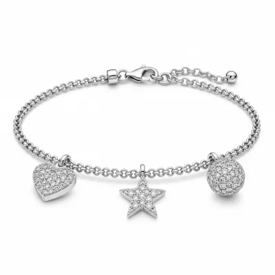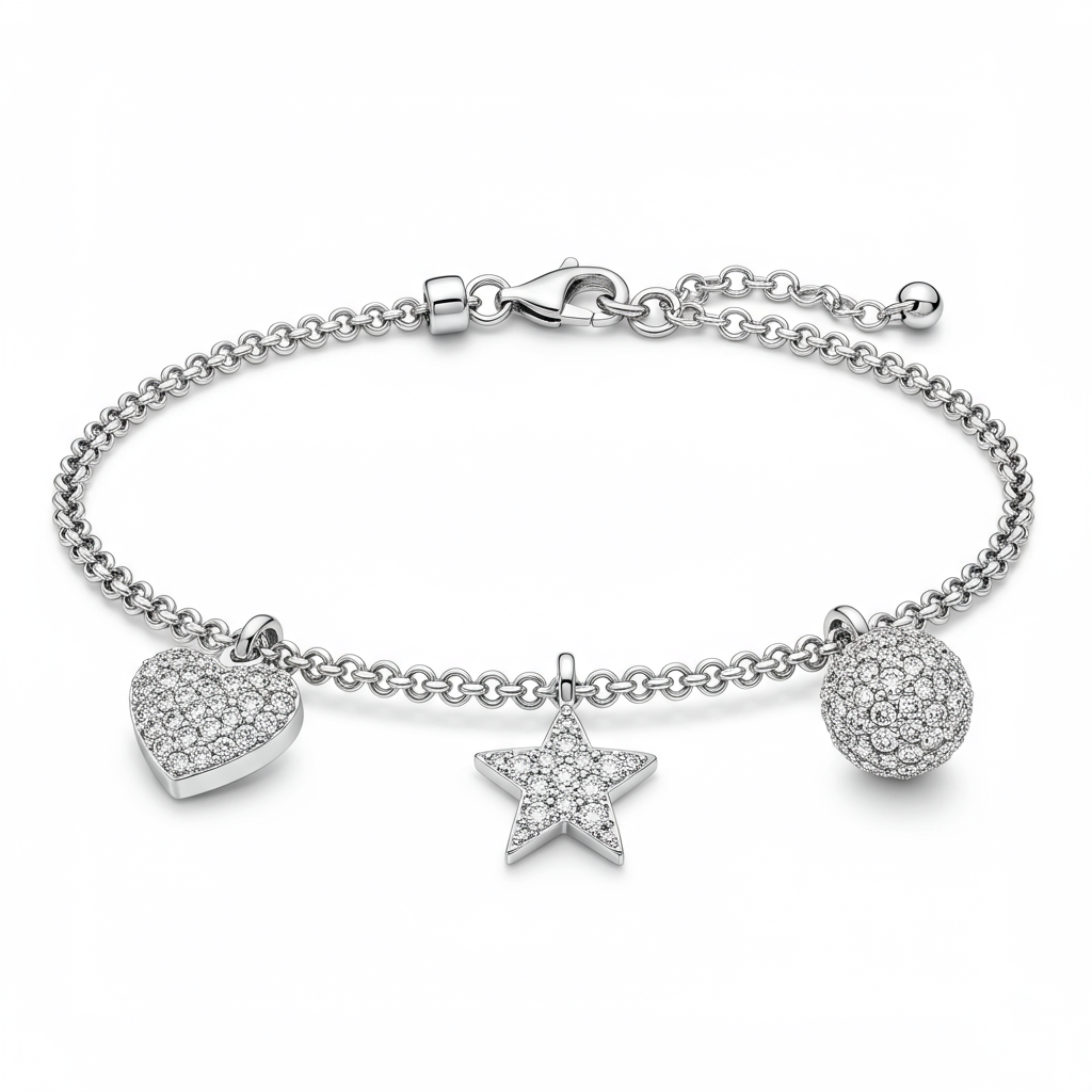 The ultimate expression of personalized luxury, this charm bracelet is meticulously crafted in luminous 18KT white gold. It features three intricate, detachable charms—a heart, a star, and a classic sphere—each set with micro-pave diamonds. The VVS clarity stones catch the light from every angle, creating a continuous and captivating sparkle that moves elegantly with the wearer. This heirloom piece is designed not just as fine jewelry, but as a wearable collection of precious memories and symbols.