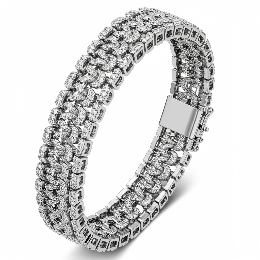 The Paracord Pattern Bracelet is a masterful fusion of industrial strength design and high jewelry elegance. Crafted in shimmering 18KT white gold, this piece reinterprets the rugged texture of paracord through finely detailed metal braiding. The intricate links are meticulously micro-paved with 1.10 carats of brilliant VVS round diamonds, capturing light from every angle. This unisex statement bracelet offers both exceptional craftsmanship and contemporary luxury, secured with a seamless, invisible clasp.