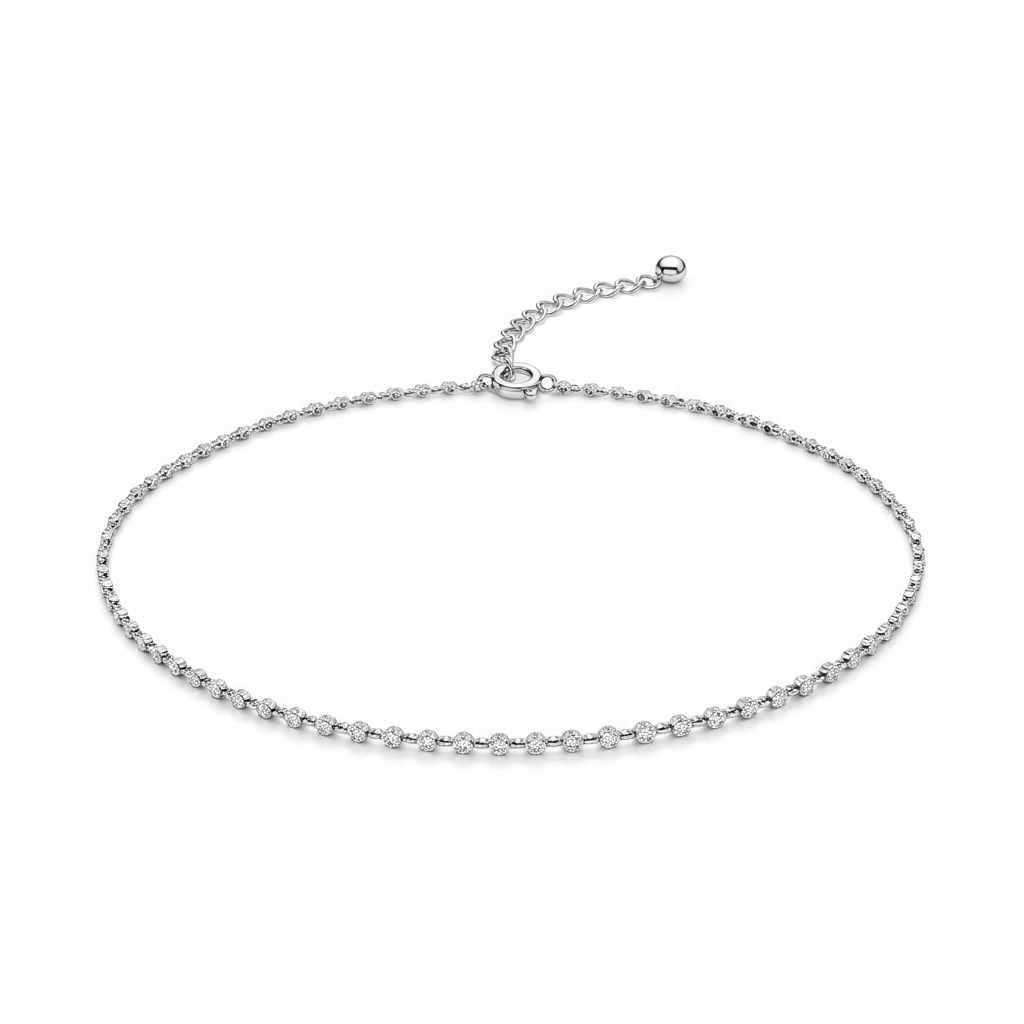This versatile piece functions perfectly as both an elegant bracelet and a sophisticated anklet, offering duality in high-end accessorizing. Crafted in radiant 18KT white gold, the delicate chain is subtly punctuated by seventy-five expertly set VVS round brilliant diamonds. The minimalist design ensures maximum comfort while delivering spectacular, continuous sparkle. Securely fastened with a precision clasp, this exquisite jewelry symbolizes enduring elegance and modern luxury.
