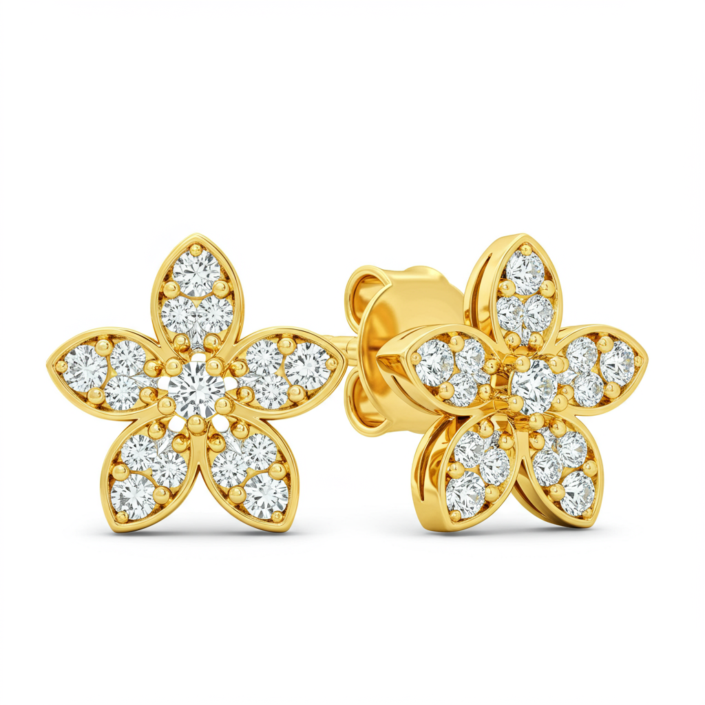 These charming 18KT yellow gold studs are designed specifically for young elegance and comfort. Featuring a delicate floral motif, each earring is centered with a brilliant VVS diamond cluster that captures light beautifully. The secure screw-back fastening ensures maximum comfort and safety for daily wear, making them an ideal first piece of fine jewelry. This timeless pair offers sophisticated sparkle suitable for any joyous occasion.