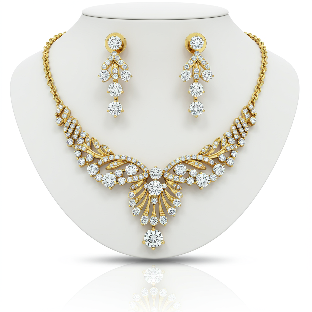 This exquisite gold necklace and earring set is the epitome of classic luxury, crafted in radiant 18KT yellow gold. The centerpiece of the necklace features a mesmerizing diamond cluster, perfectly complemented by matching drop earrings. Each piece is meticulously set with brilliant-cut VVS diamonds, ensuring unparalleled sparkle and fire. Designed for the most sophisticated occasions, this set promises to elevate any evening attire with timeless elegance and grace. This ensemble represents superior craftsmanship and enduring style.