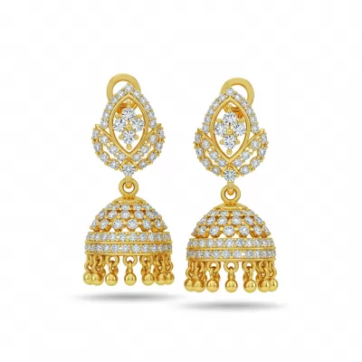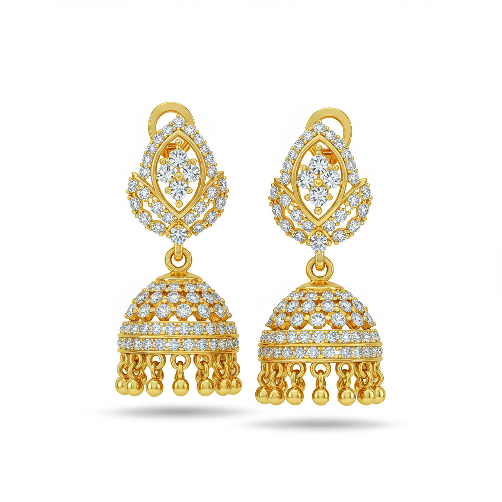 These opulent Jhumka Earrings are a magnificent fusion of traditional grandeur and modern refinement, meticulously crafted in radiant 18KT yellow gold. The classic bell shape is exquisitely detailed with intricate filigree work and adorned with brilliant round diamonds. Cascading diamonds dangle delicately, catching the light with every movement, creating a mesmerizing sparkle. They are the perfect statement piece for high-end celebrations, designed to become a cherished heirloom.