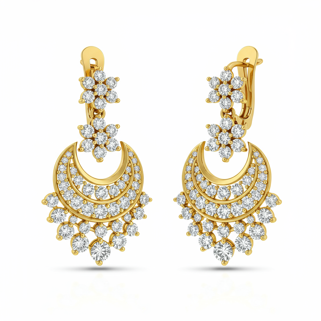 These exquisite Chandbali earrings redefine traditional glamour with a modern sensibility. Crafted in radiant 18KT Yellow Gold, the sweeping crescent silhouette is meticulously detailed with micro-pave diamonds, offering exceptional sparkle and movement. This statement piece captures the heritage of Mughal design while ensuring contemporary luxury suitable for grand occasions. The meticulous setting of high-clarity diamonds guarantees a breathtaking display of light from every angle.
