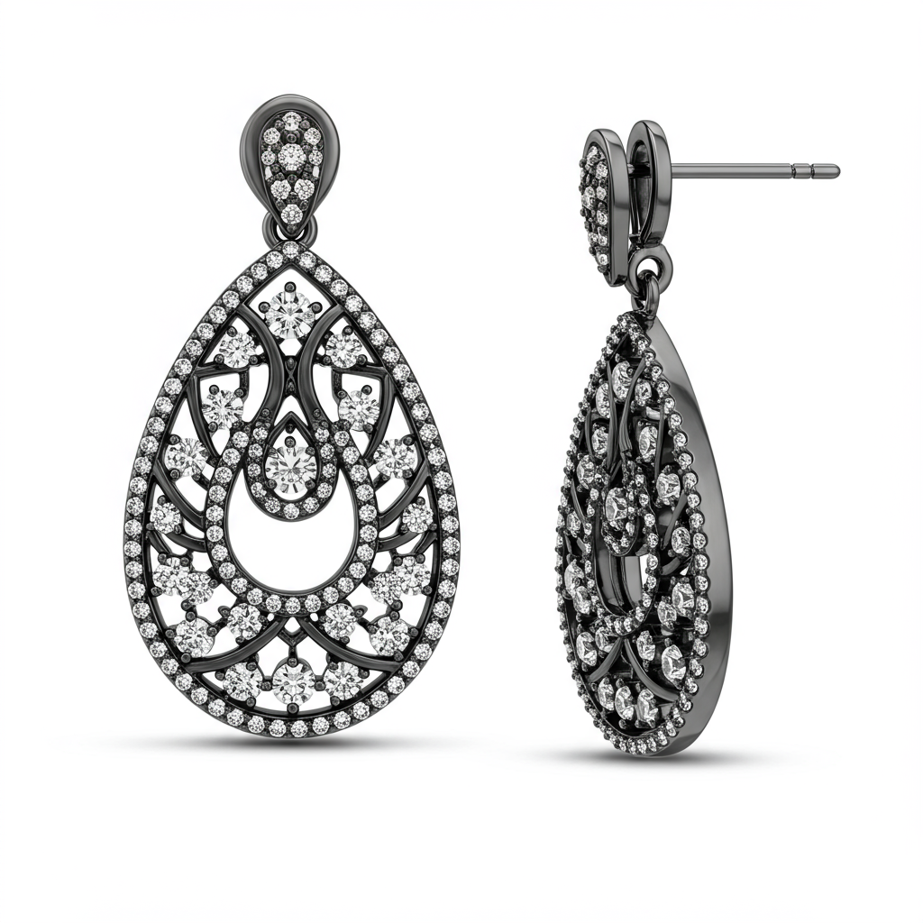 These striking oxidized earrings merge modern design with timeless luxury. Crafted in 18KT gold with a distinctive black rhodium finish, they offer a dramatic contrast against the brilliant micro-pave diamonds. The intricate setting showcases VVS clarity stones, capturing light from every angle. Perfect for making a bold, sophisticated statement, these drop hoops redefine evening wear elegance.