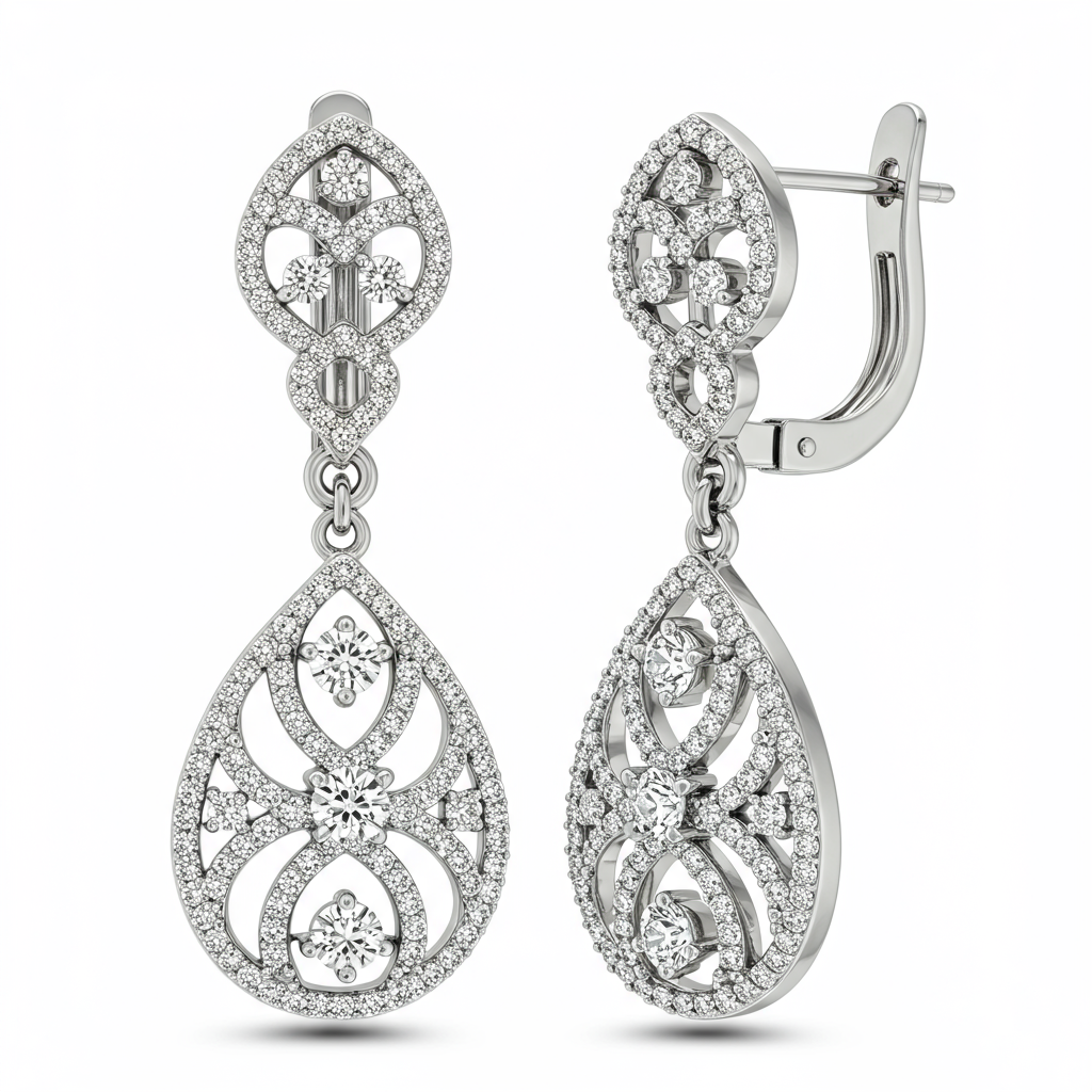 These elegant silver earrings for women redefine classic luxury through modern design. Crafted in luminous 18KT white gold, the delicate filigree structure showcases a cascading arrangement of brilliant-cut diamonds. The fluid movement and exceptional sparkle make these the perfect accessory for both black-tie events and elevated daily wear. They offer a refined statement of enduring style and impeccable craftsmanship.