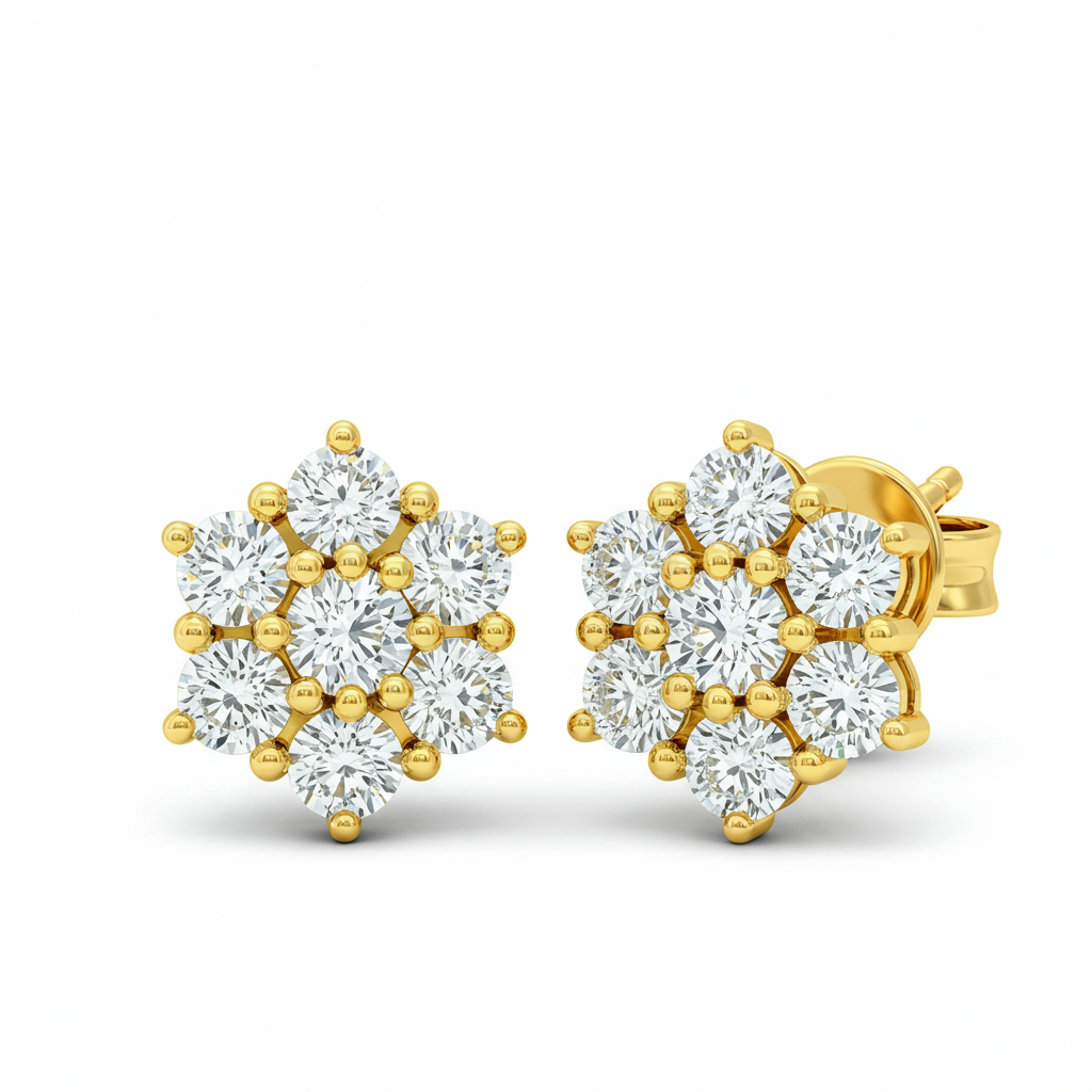 These exquisite 18KT yellow gold earrings redefine everyday luxury, meticulously crafted into a brilliant floral cluster design. Each earring is illuminated by numerous VVS G-H round brilliant diamonds, delivering a radiant sparkle that captures light effortlessly. The sophisticated design ensures a comfortable fit while providing maximum visual impact, making them the perfect accessory for both professional settings and evening wear. They stand as a testament to impeccable craftsmanship and timeless style, celebrating the modern woman.