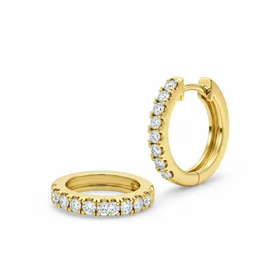 These exquisite 2 gram gold huggie earrings offer understated elegance for daily wear. Crafted in lustrous 18KT yellow gold, the delicate hoop design is meticulously detailed with a shimmering micro-pave setting. They wrap closely around the earlobe, providing maximum sparkle with minimal weight. Perfect for stacking or worn alone, these earrings are a timeless addition to any fine jewelry collection.