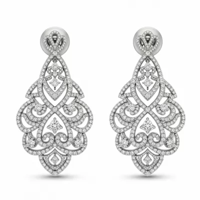 These exquisite Bugadi earrings blend traditional Indian craftsmanship with modern diamond luxury. Designed to gracefully adorn the helix and lobe, they feature an intricate structure crafted from highly polished 18KT white gold. Each cuff is meticulously paved with brilliant VVS grade diamonds, creating a cascade of light and unmatched sparkle. These earrings offer a striking statement piece, perfect for sophisticated evening wear or traditional occasions.
