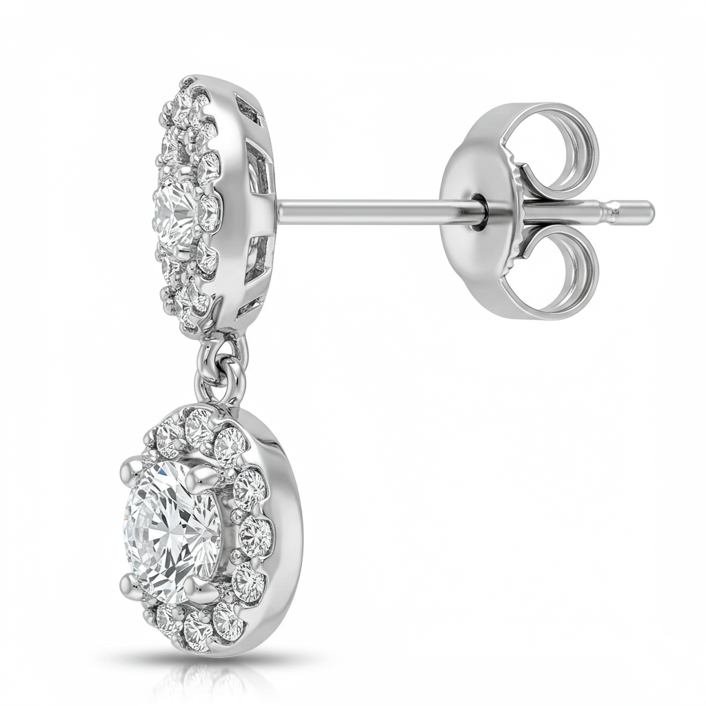 These magnificent halo drop earrings redefine luxury, featuring dazzling central diamonds encircled by a precise micro-pave setting. Crafted in polished 18KT white gold, the design maximizes light return for exceptional sparkle and depth. They secure comfortably with post backs, making them ideal for both sophisticated evening wear and elevating everyday elegance. This pair offers an undeniable statement of classic beauty and modern refinement.