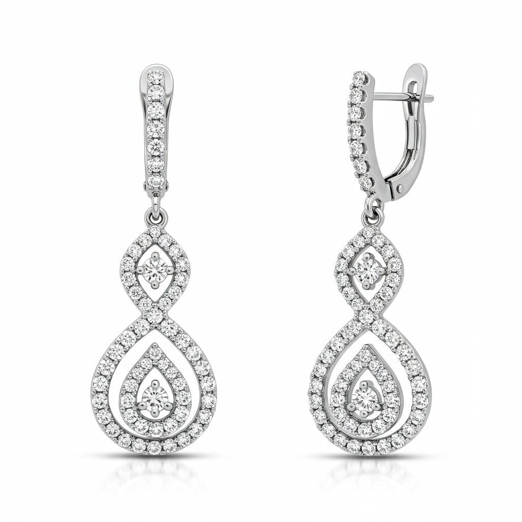 These elegant drop earrings feature a fluid, articulated design, meticulously crafted in radiant 18KT white gold. Each earring suspends a delicate cascade of brilliant-cut VVS diamonds, catching the light with every subtle movement. The sophisticated linear silhouette offers a timeless yet modern allure, perfect for elevating any evening ensemble. Experience the ultimate luxury and effortless sparkle inherent in this exceptional jewelry piece.