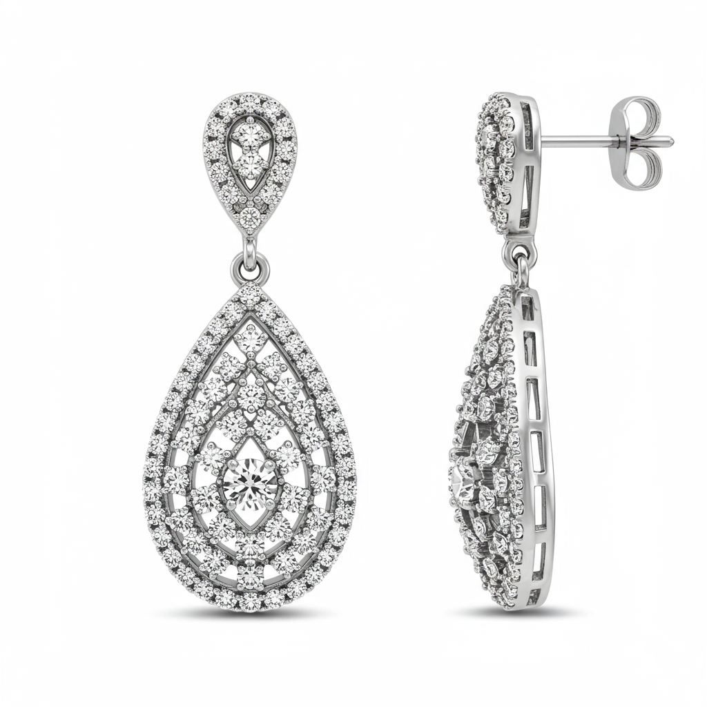 These exquisite artificial drop earrings redefine modern elegance, crafted specifically for the discerning young woman. Featuring a sophisticated cascade design, the 18KT white gold setting brilliantly highlights the intricate pavé detailing. The brilliant simulated stones capture and reflect light with dazzling intensity, ensuring a captivating sparkle with every movement. They are the perfect statement piece, blending high fashion flair with timeless sophistication.