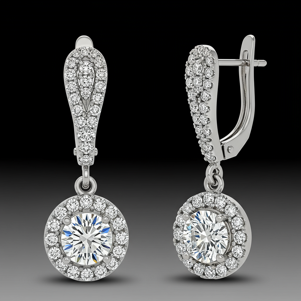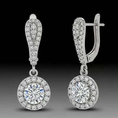 These exquisite stone earrings feature a brilliant, central bezel-set diamond encircled by a magnificent halo of smaller accent diamonds. Crafted in luxurious 18KT white gold, the design captures and reflects light from every angle, ensuring maximum brilliance. The meticulous VVS clarity diamonds promise unparalleled sparkle and timeless elegance. Secured with a secure lever-back closure, these earrings offer sophistication perfect for evening wear or special occasions.