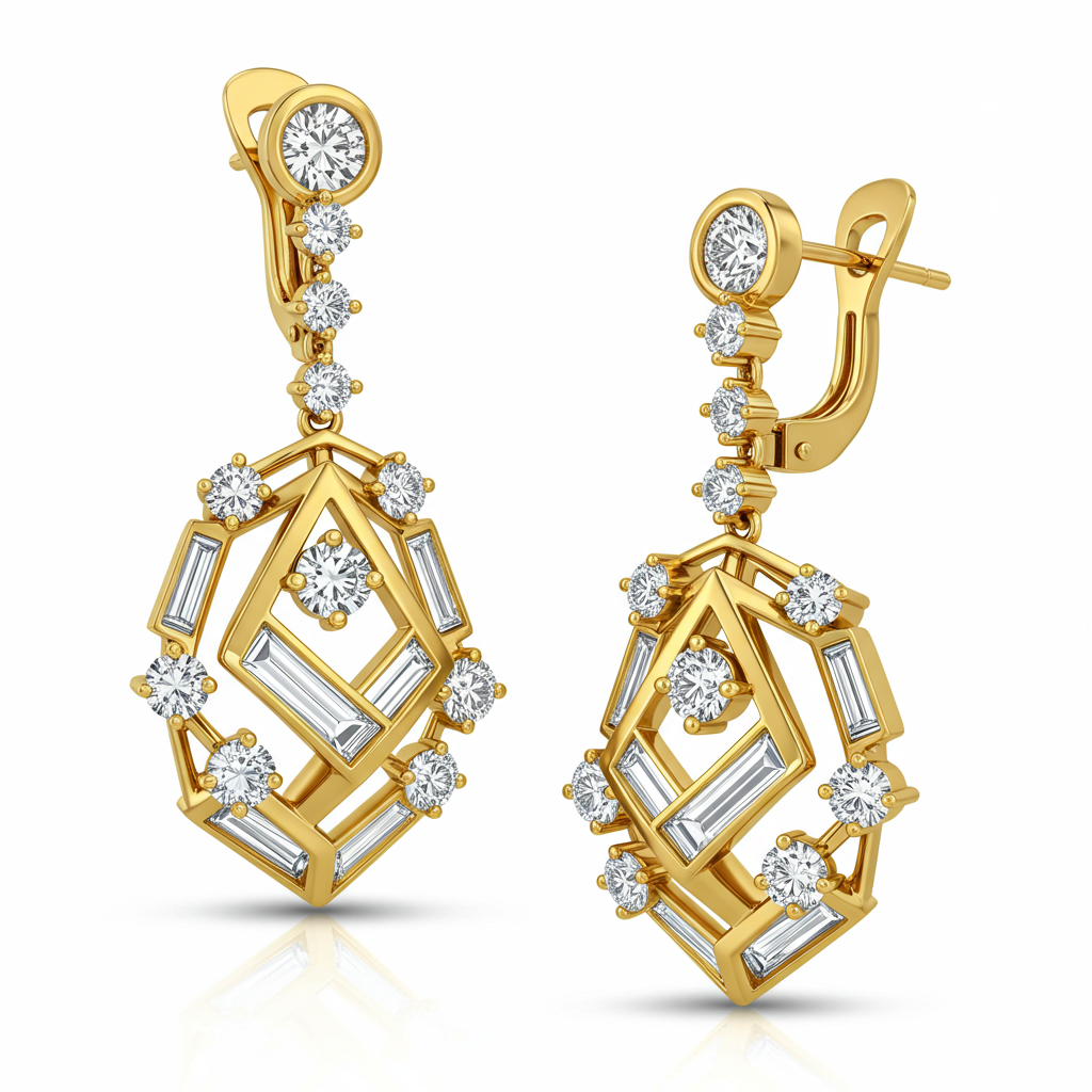 A masterpiece of modern geometry, these 18KT yellow gold drop earrings define contemporary luxury. They feature a striking architectural silhouette accented by meticulously set natural diamonds. The contrast between the highly polished gold surfaces and the brilliant stones creates dazzling movement. Perfect for making an elegant, sophisticated statement at any grand occasion, these are designed for the discerning wearer.